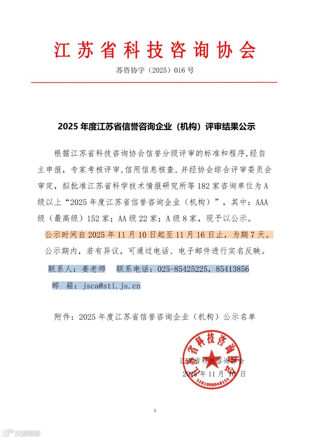 根据江苏省科技咨询协会信誉分级评审的标准和程序,经自主申报,专家考核评审,信用信息核查, 并经协会综合评审委员会审定,拟批准江苏省科学技术情报研究所等182家咨询单位为A级以上“2025年度江苏省信誉咨询企业(机构)”,其中:AAA级(最高级)152家;AA级22家;A级8家,现予以公示。