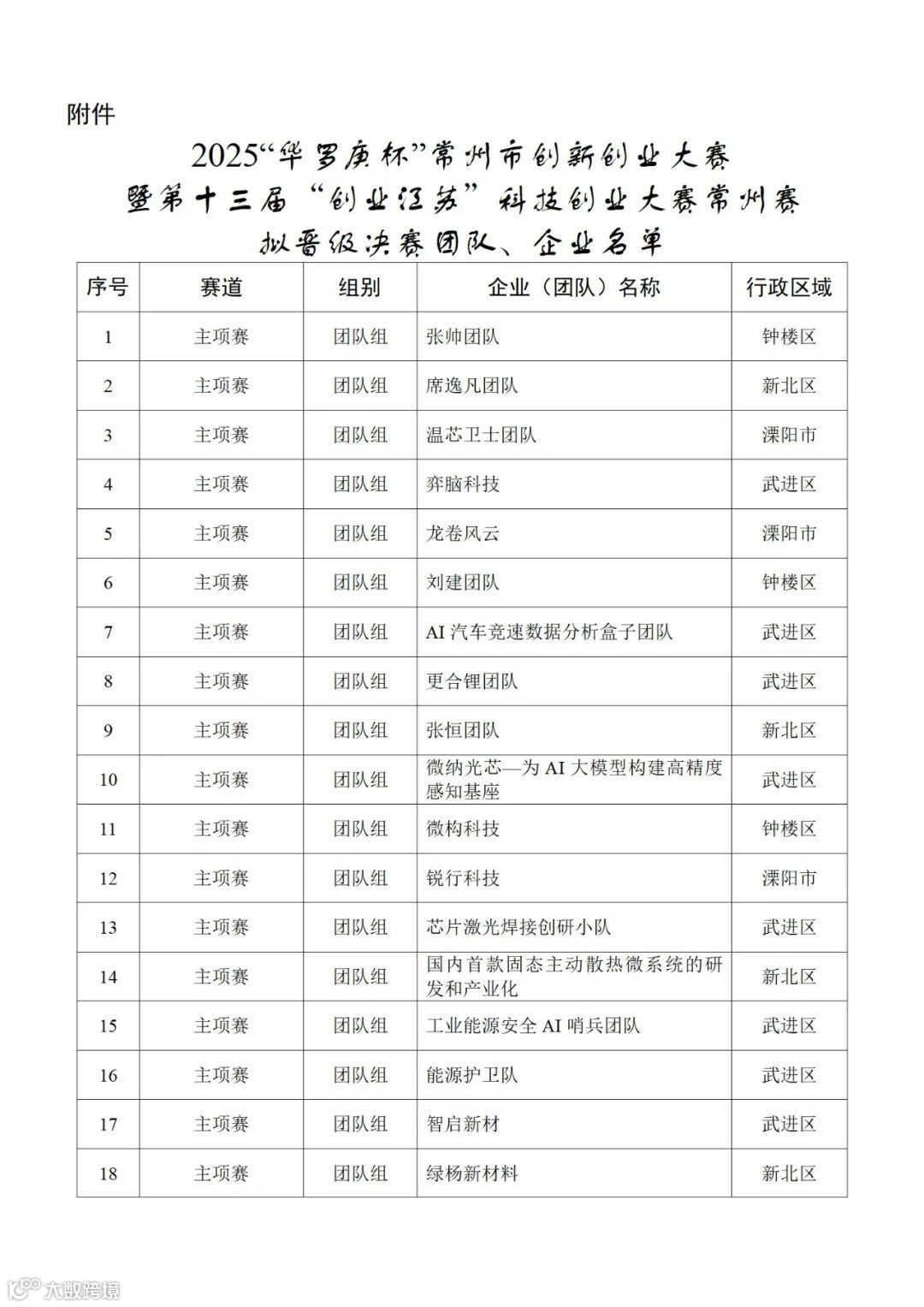 附件:2025“华罗庚杯”常州市创新创业大赛暨第十三届“创业江苏”科技创业大赛常州赛拟晋级决赛团队、企业名单