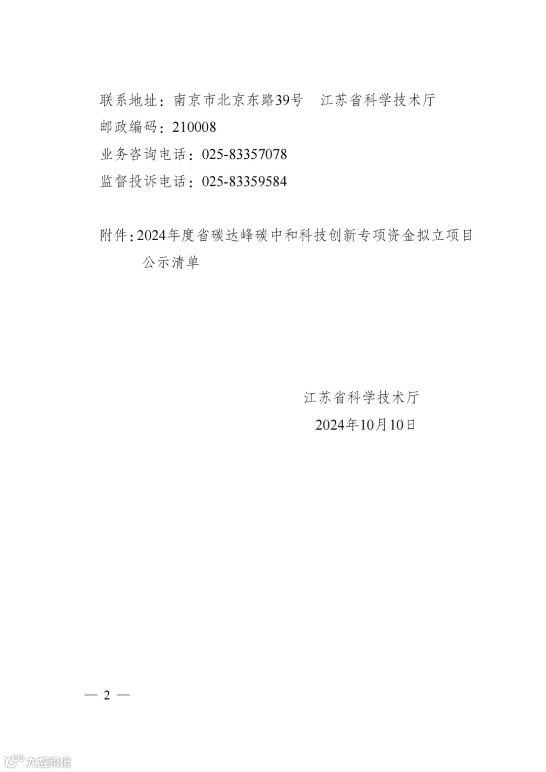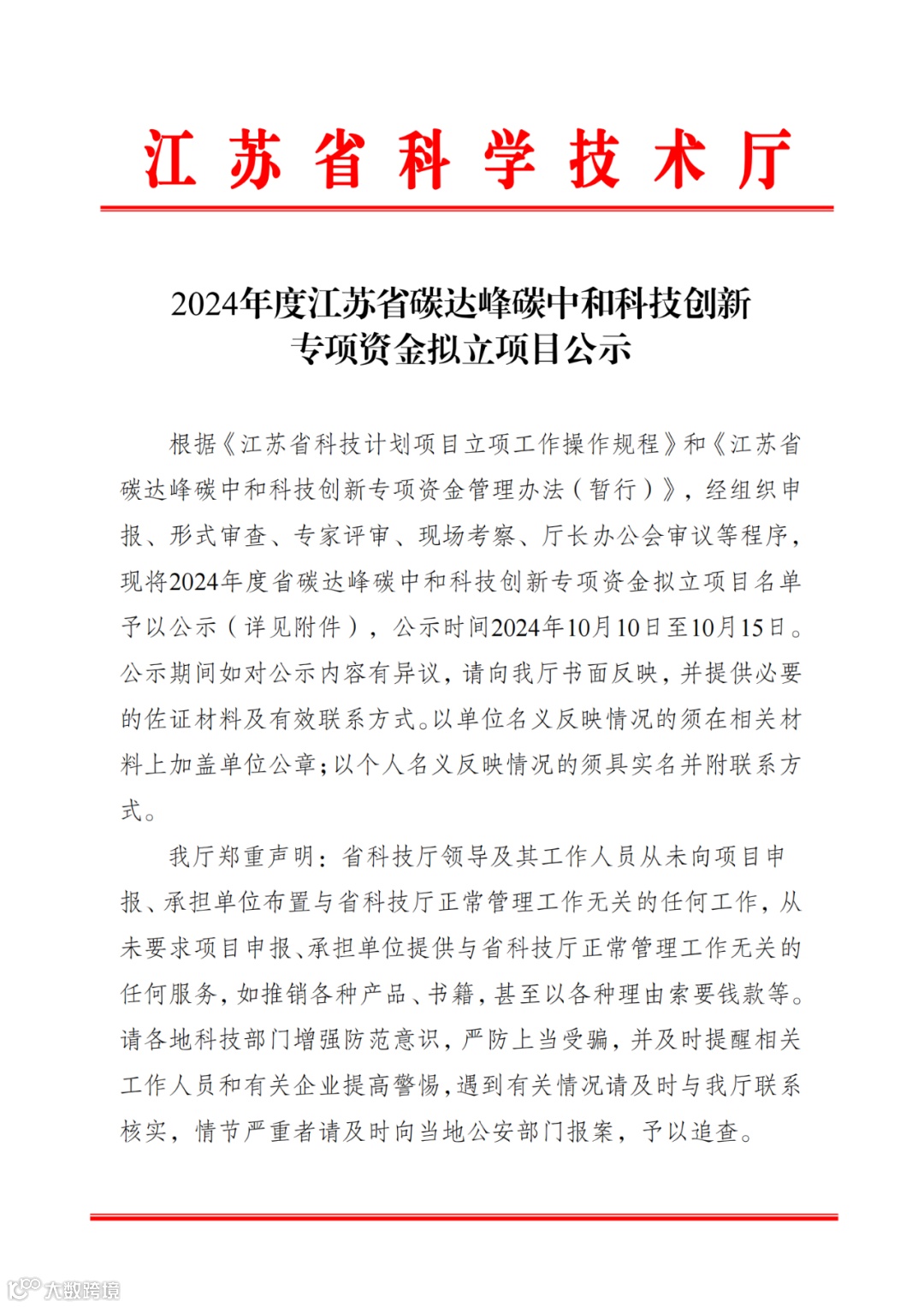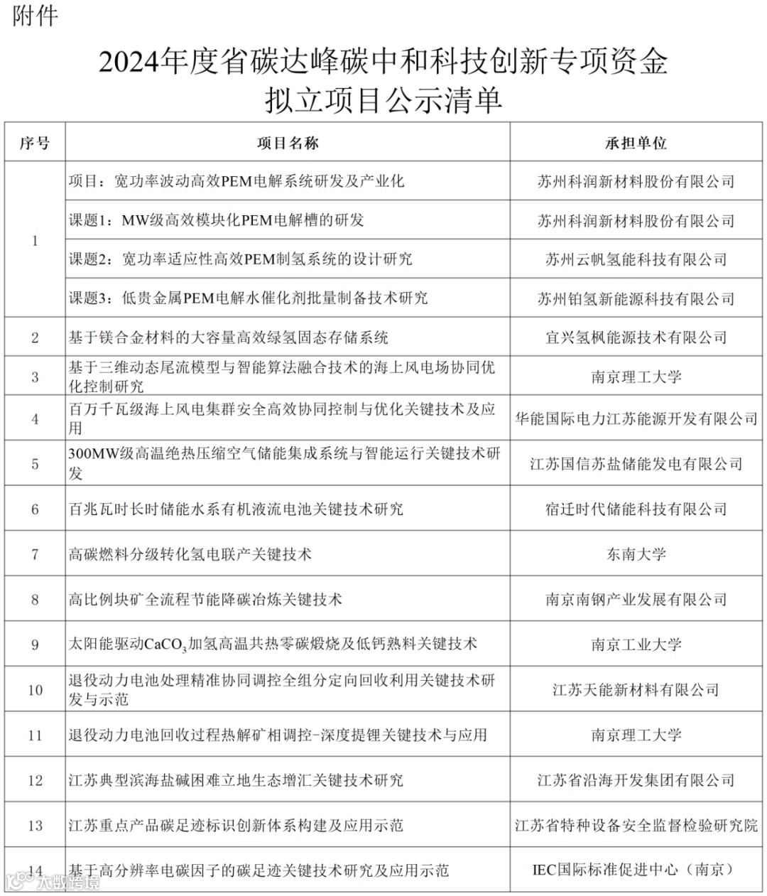 〖公示〗2024年度江苏省碳达峰碳中和科技创新专项资金拟立项目公示