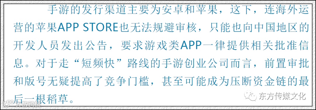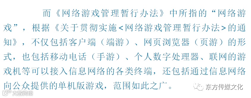 近年来,网络游戏逐渐从依赖电脑的端游与页游、向手游APP扩张,广电总局于2016年应势专门出台了《关于移动游戏出版服务管理的通知》。该通知规定,出版商负责移动游戏的出版申报工作,移动游戏须经省级出版行政主管部门审核、国家新闻出版广电总局批准,取得【批准文号】、【出版物号】,并游戏开始前、《健康游戏忠告》后设置专门页面标明相关信息。