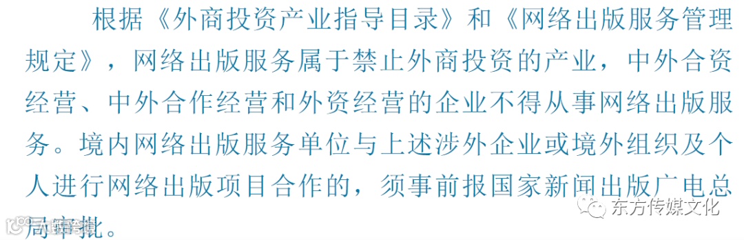 互联网文化经营(音乐除外)属于《外商投资产业指导目录》中禁止外商投资的产业。根据《进一步加强网络游戏前置审批和进口网络游戏审批管理的通知》,外商禁止以独资、合资、合作等方式在中国境内投资从事网络游戏运营服务,也不得通过签订协议、技术支持、提供对战平台等间接方式变相控制和参与网络游戏运营业务。