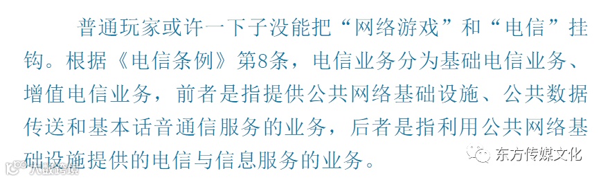 根据《电信业务分类目录》,电信业务向下还区分诸多的业务种类,网络游戏运营属于增值电信业务之下的“互联网信息服务”