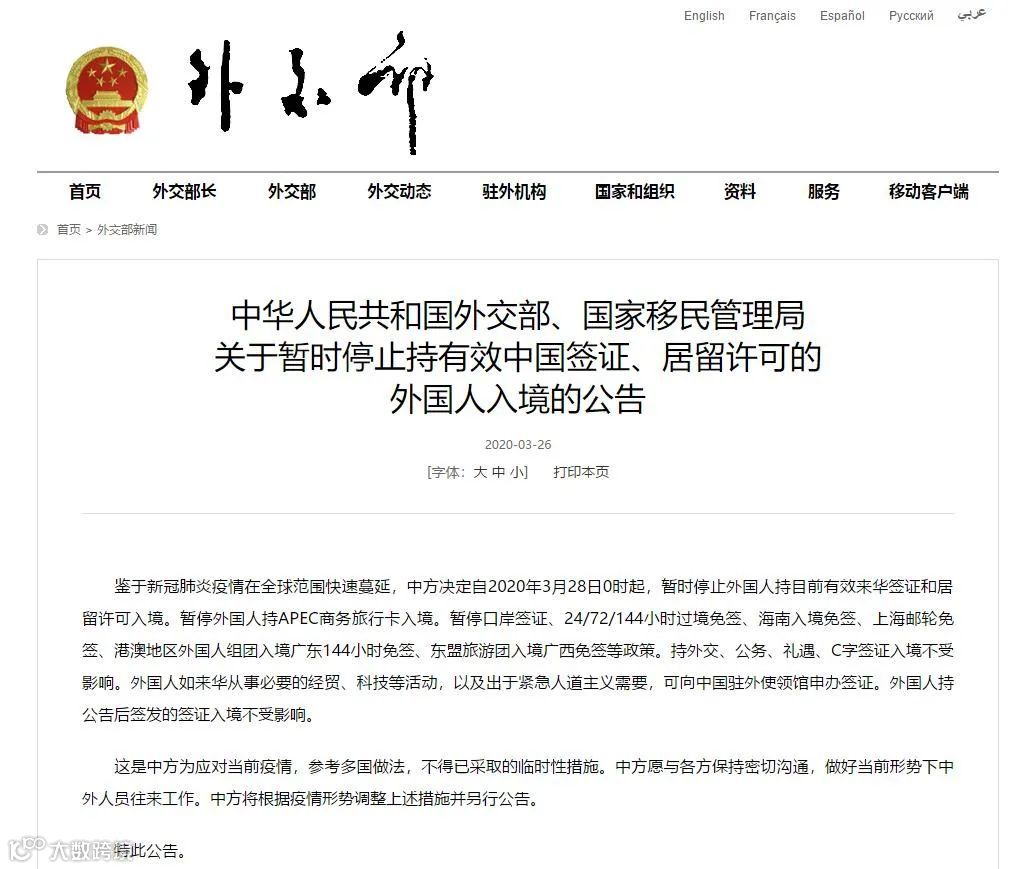 外交部、国家移民管理局发布公告:自2020年3月28日0时起,暂停持有效中国签证、居留许可的外国人入境。