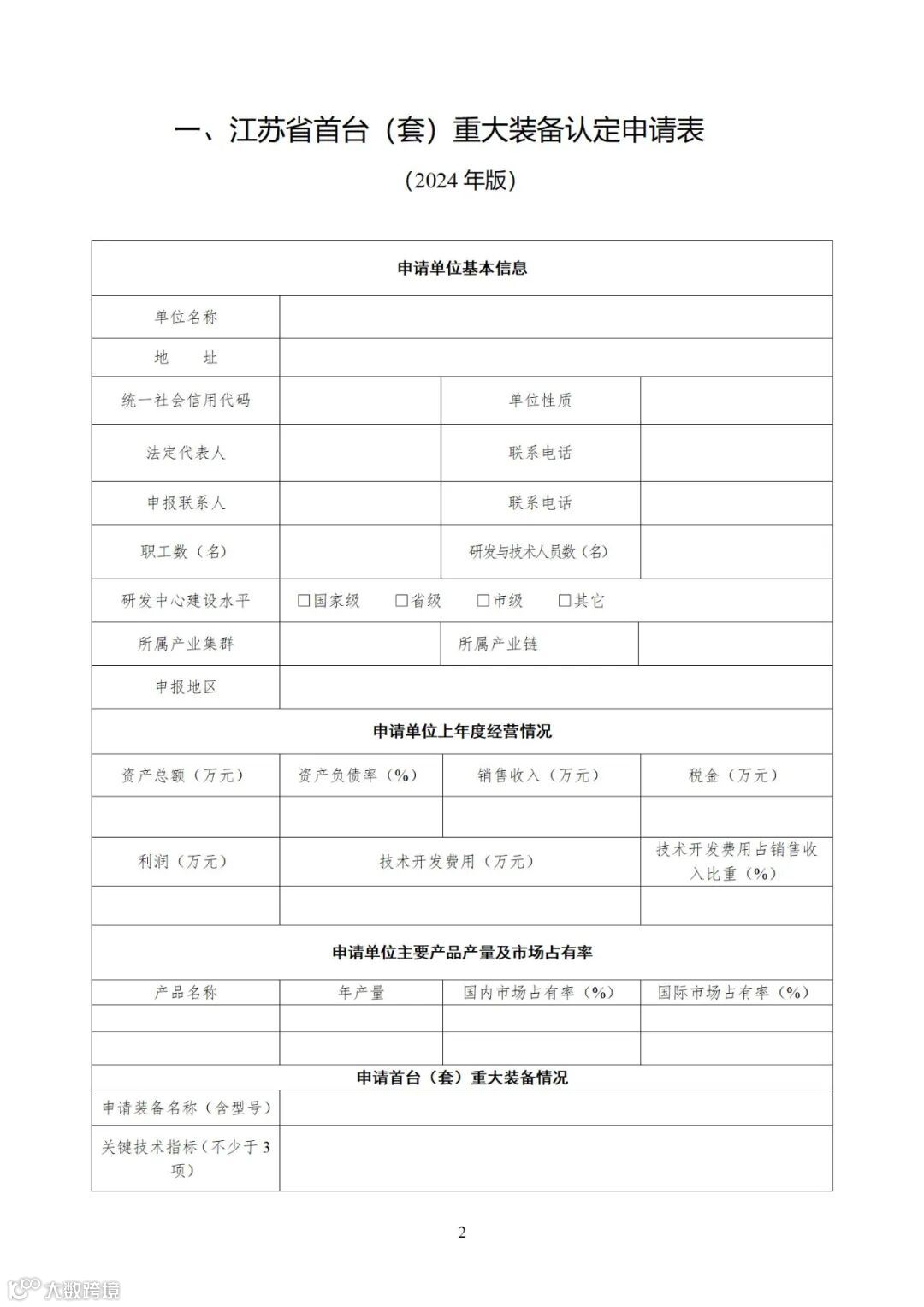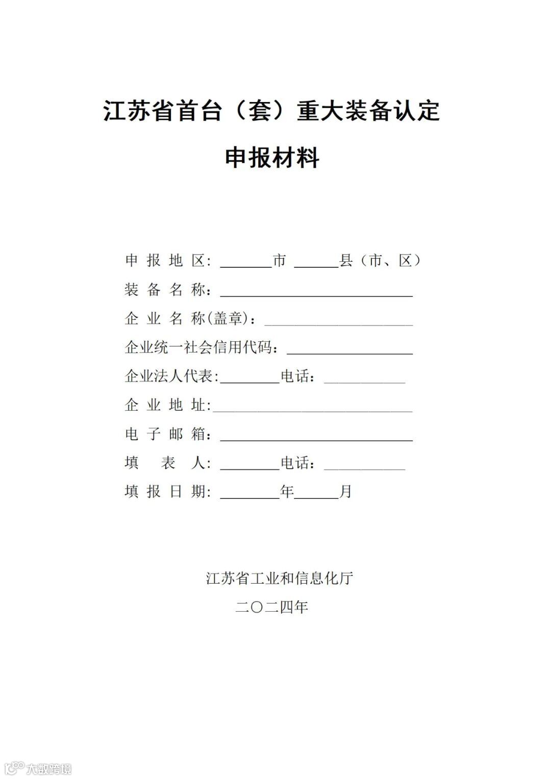 发展规划》《江苏省制造业智能化改造和数字化转型三年行动计划(2022-2024年)》等文件精神,推动首台(套)重大装备研发应用,提升装备制造业高质量发展水平,现组织开展2024年江苏省首台(套)重大装备认定申报工作,有关事项通知如下: