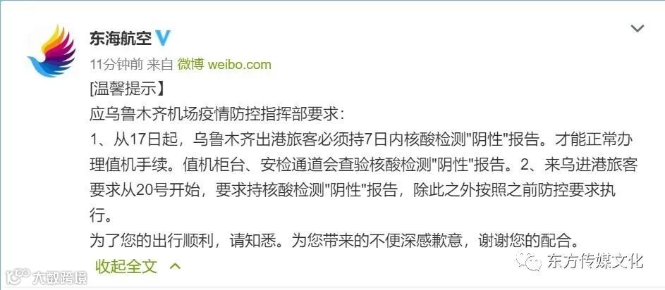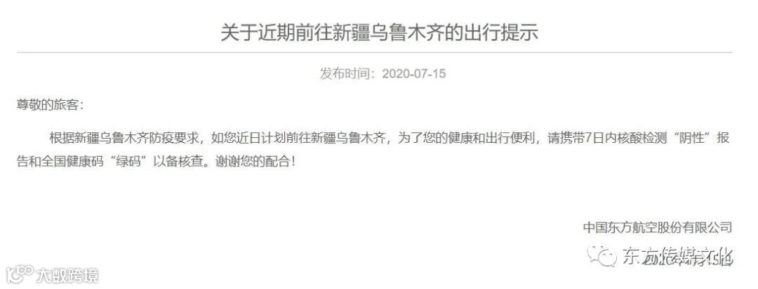 目前,多家航空公司已经向旅客发出近期前往乌鲁木齐的出行防疫提示,进出乌鲁木齐旅客需提供7天内核酸检测阴性报告。