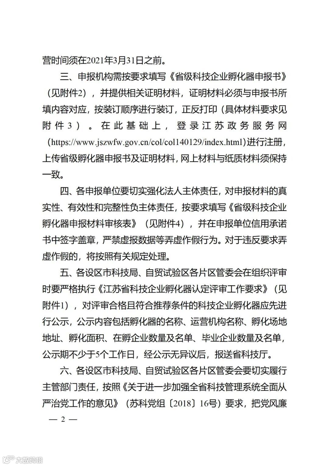1.各申报单位应按照《省孵化器通知》、《省众创空间通知》要求填写申报书、提供证明材料并完成申报材料审核表,盖章后提交至所在地科技主管部门;其中,省级孵化器申报机构须登录江苏政务服务网,注册后在线提交相关申报材料。各申报单位要切实强化法人主体责任,对申报材料的真实性、有效性和完整性负主体责任,严禁虚报数据等弄虚作假行为。对于违反要求弄虚作假的,将按照有关规定处理。