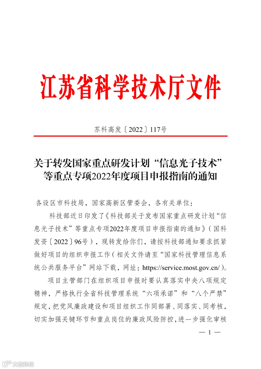 〖通知〗关于转发国家重点研发计划“信息光子技术”等重点专项2022年度项目申报指南的通知