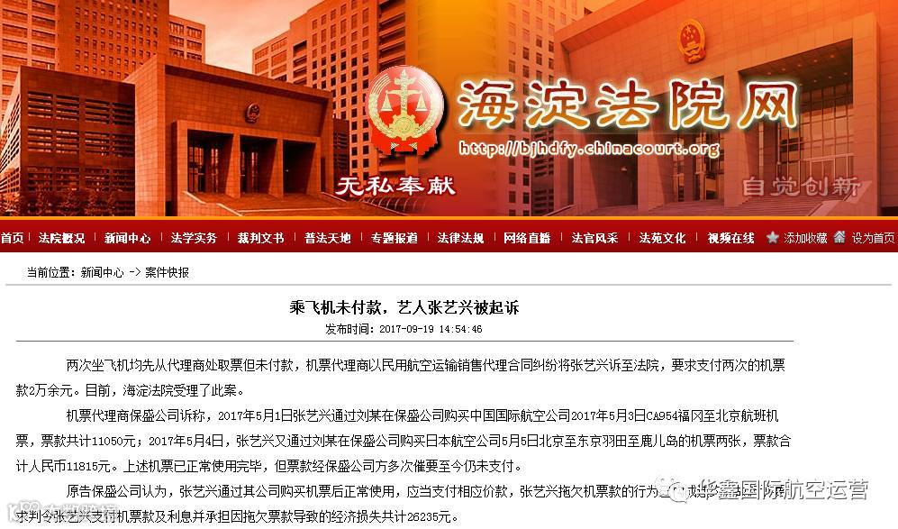 新浪娱乐讯 据海淀法院网,两次坐飞机均先从代理商处取票但未付款,机票代理商以民用航空运输销售代理合同纠纷将张艺兴[微博]诉至法院,要求支付两次的机票款2万余元。目前,海淀法院受理了此案。