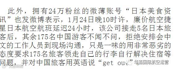 有在场中国游客表示,当航空公司宣布航班延误后,职员只带走5名日本旅客,却没有理会余下的175名中国旅客,并且拒绝安排会说中文的工作人员到场协助双方沟通。航空公司职员更以“恶劣态度”要求他们领走自己的行李,自行解决住宿等问题,还用英语对中国游客说“get out(出去)”,令他们相当不满。