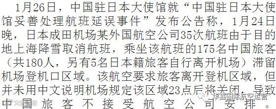 中国驻日本大使馆获知消息后,连夜第一时间紧急介入处理。经使馆协调,部分旅客听从引导由航空公司介绍附近酒店入住休息,另有100余名旅客坚持在登机口附近等候,期间一名旅客与工作人员发生冲突,成田机场警察到场处理并带走该旅客。经使馆紧急交涉,警察承诺保证当事人安全并提供翻译。使馆还紧急联系律师,派员与律师一起赴80公里外的成田机场,与机场当局及该航空公司进行交涉。经反复协调,航空公司承诺妥善对待滞留旅客,发放就餐补偿并安排下一个航班运送旅客。经努力,滞留旅客已于26日凌晨顺利返回上海。我馆还同时派员探望被警察带走调查的中国旅客,要求警方依法公正处理、切实保障当事人的合法权益。