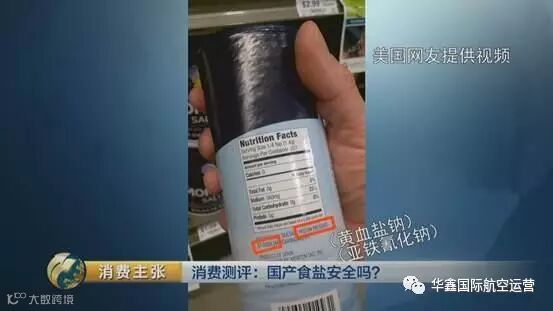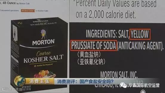 在美国网友提供的视频中,美国超市里售卖的莫盾牌的一款海盐标明含有亚铁氰化钠。