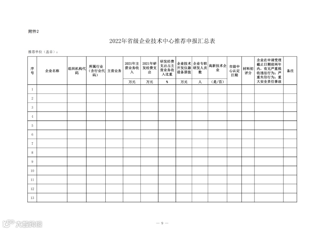 三、请各地对企业申报材料严格审核把关,确保数据与佐证附件一致,确保申报材料没有缺漏,确保申报企业符合基本条件,确保初评分准确,并于2022年5月20日前在“管理系统”完成各市推荐提交操作。另正式行文并附《省级企业技术中心推荐申报汇总表》(见附件2)于2022年5月27日前报送我厅,同时将推荐企业名单抄送同级发改、科技、财政和税务部门。我厅将依据《工作指南》要求进行复核和评分,按《管理办法》要求对结果进行公示。