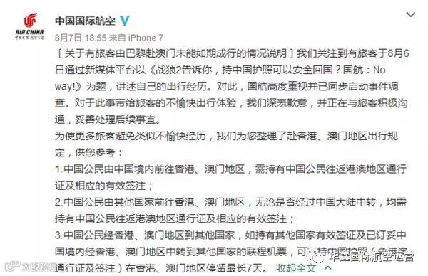 国航8月7日官微对此事回应坚称,中国公民由其他国家前往港澳,无论是否经过大陆中转,均需持有中国公民往返港澳地区通行证及相应的有效签注。