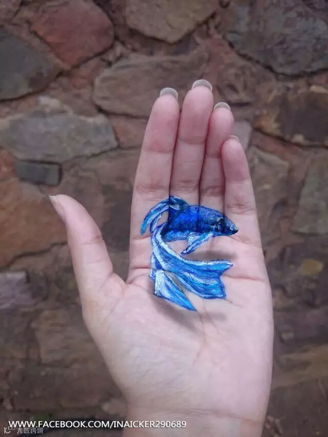 南非的插画师,艾安西·奈克尔(Iantha Naicker),则擅长在掌心作画。她每天花三到四个小时在手上画自己想象到的东西,各种动物啊什么的。使用丙烯颜料和白色中性笔绘制,手掌还自带3D效果。