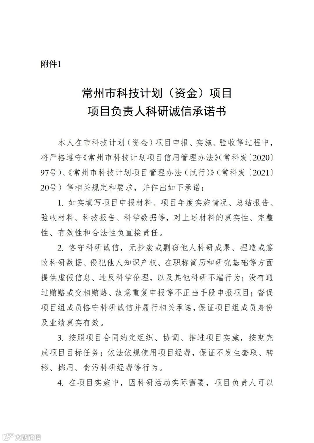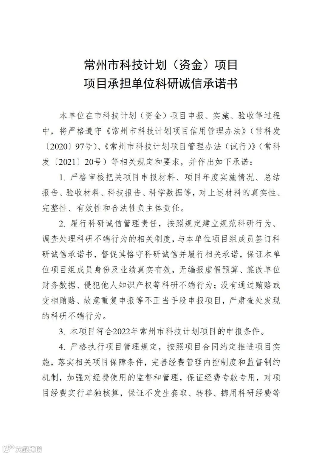 3.每个项目应提供一份市级财政专项资金申请使用科研诚信承诺书(项目负责人科研诚信承诺书、项目承担单位科研诚信承诺书,固定格式见附件或在市科技服务平台附件中下载)。签字盖章后扫描并上传至系统,承诺书原件不要和书面材料装订在一起,由主管部门汇总后统一提交至常州市科技资源统筹服务中心科技项目服务科(常州市广化街1号金谷大厦9楼910室);