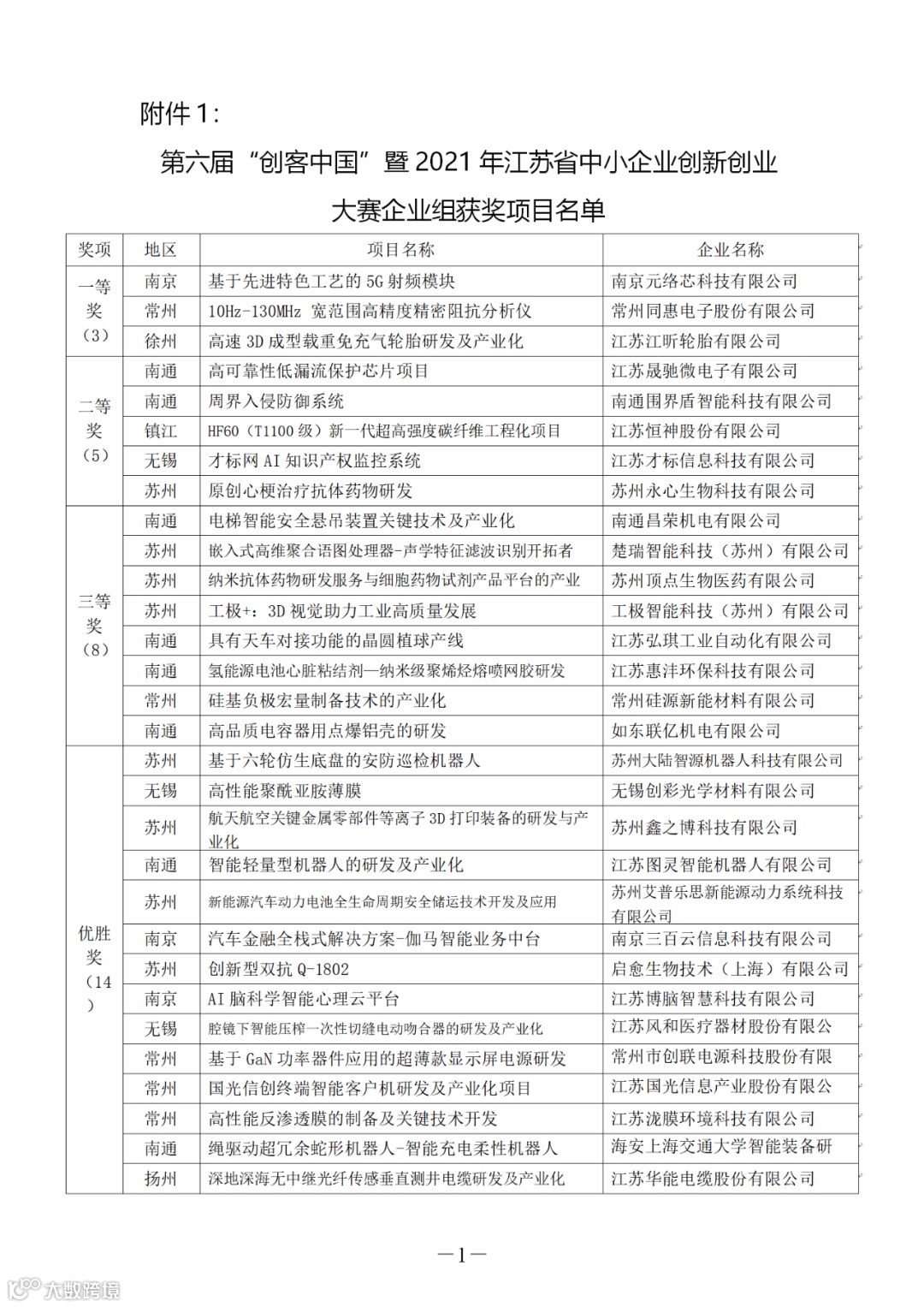 第六届“创客中国”暨2021年江苏省中小企业创新创业大赛企业组获奖项目名单