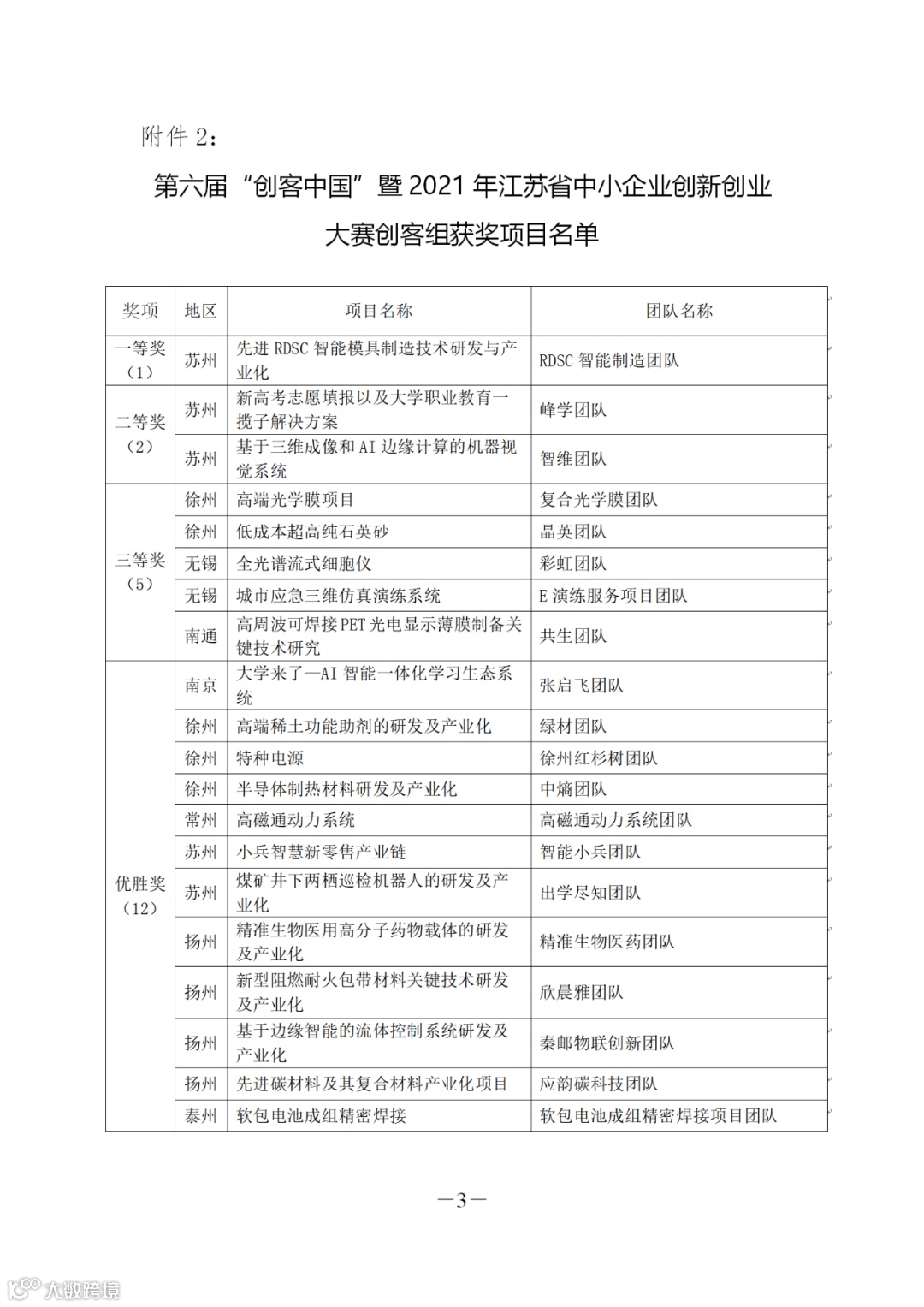 〖公示〗关于公布第六届“创客中国”暨2021年江苏省中小企业创新创业大赛获奖名单的通知