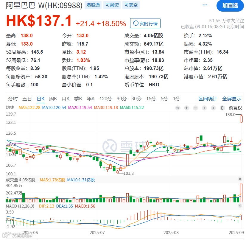 阿里巴巴作为中国电商和云计算领域的领导者,其业务多元化程度高,抗风险能力强。当前估值未能充分反映其多个业务板块的协同价值和增长潜力。
