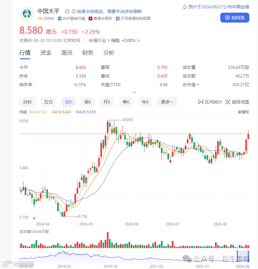 不仅如此,我们还认为可以持续关注港股中国太平。中国太平最近已经开始反弹。中国太平资产负债两端弹性充足,居民储蓄意愿强烈叠加报行合一政策下,预计2024NBV有望实现30%左右的增长,这将快于其他保险公司。并且公司2023年业绩发布会上指出其资产端历史风险已经基本出清,轻装上阵,利润高增长可期。