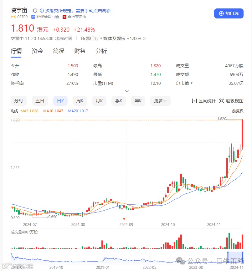 我们在港股提及的标的映宇宙(HK03700)在近期也迎来了股价爆发。