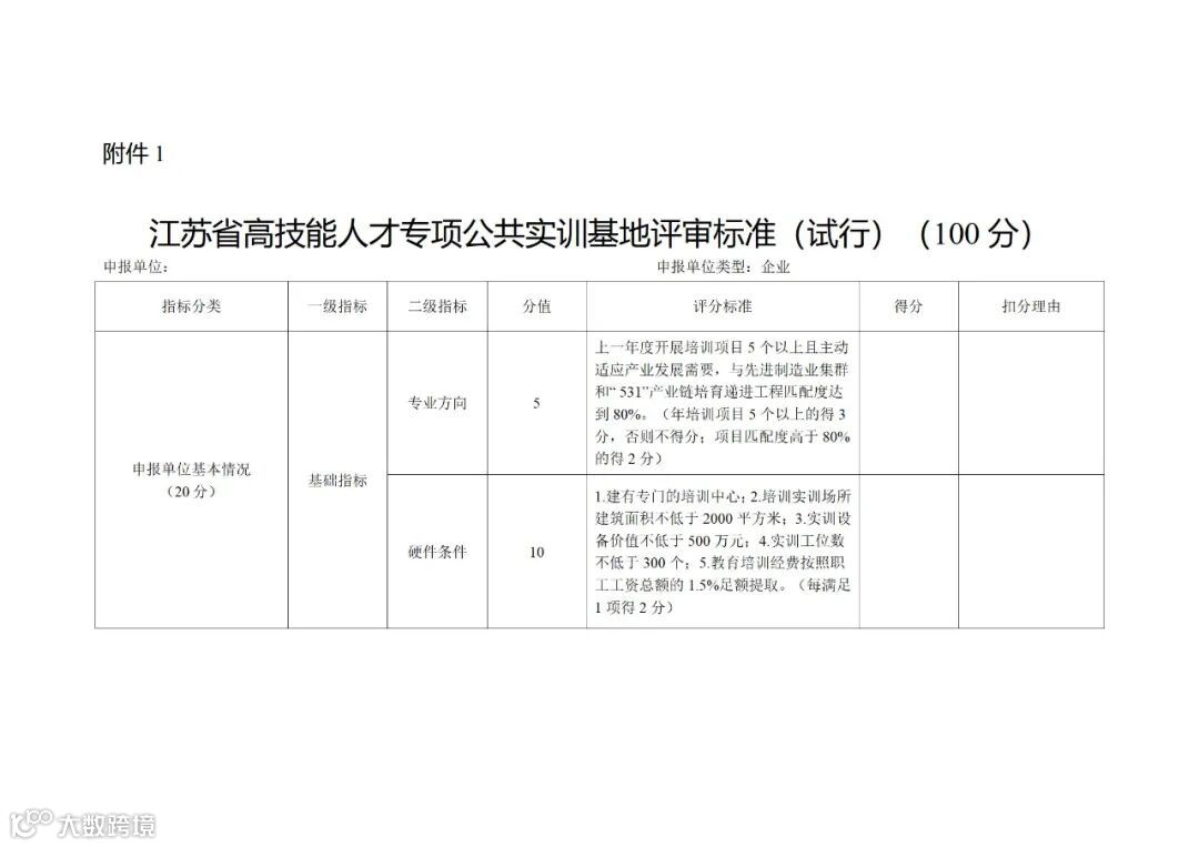 1.江苏省高技能人才专项公共实训基地评审标准(企业)(试行).doc