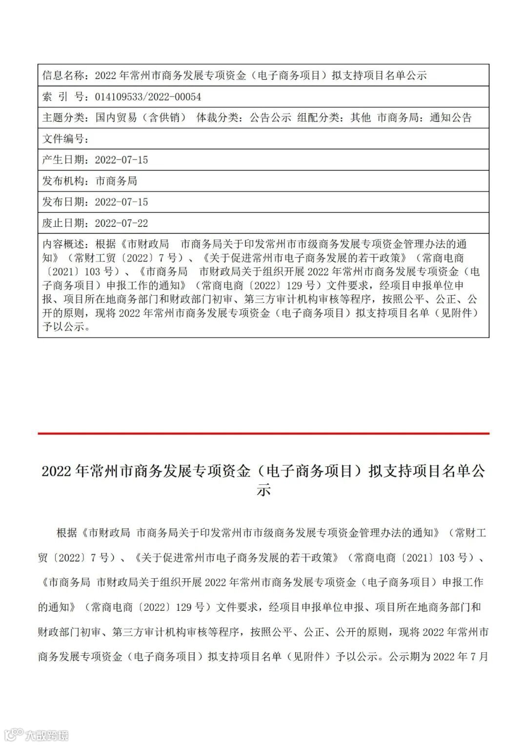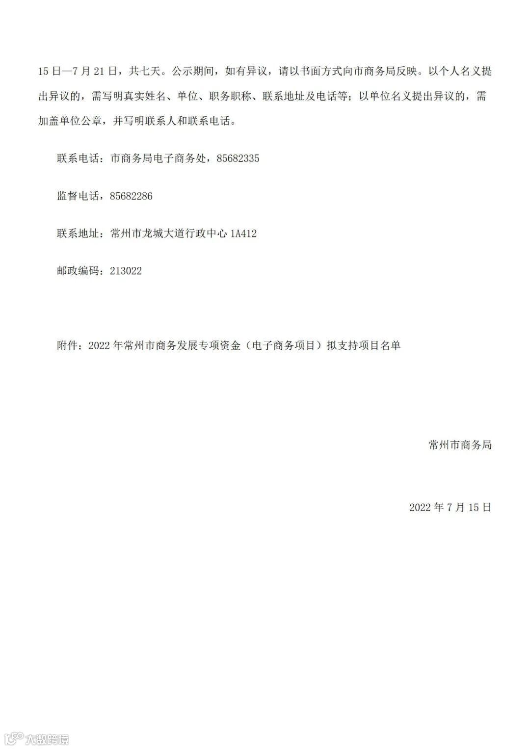 根据《市财政局 市商务局关于印发常州市市级商务发展专项资金管理办法的通知》(常财工贸〔2022〕7号)、《关于促进常州市电子商务发展的若干政策》(常商电商〔2021〕103号)、《市商务局 市财政局关于组织开展2022年常州市商务发展专项资金(电子商务项目)申报工作的通知》(常商电商〔2022〕129号)文件要求,经项目申报单位申报、项目所在地商务部门和财政部门初审、第三方审计机构审核等程序,按照公平、公正、公开的原则,现将2022年常州市商务发展专项资金(电子商务项目)拟支持项目名单(见附件)予以公示。公示期为2022年7月15日—7月21日,共七天。公示期间,如有异议,请以书面方式向市商务局反映。以个人名义提出异议的,需写明真实姓名、单位、职务职称、联系地址及电话等;以单位名义提出异议的,需加盖单位公章,并写明联系人和联系电话。