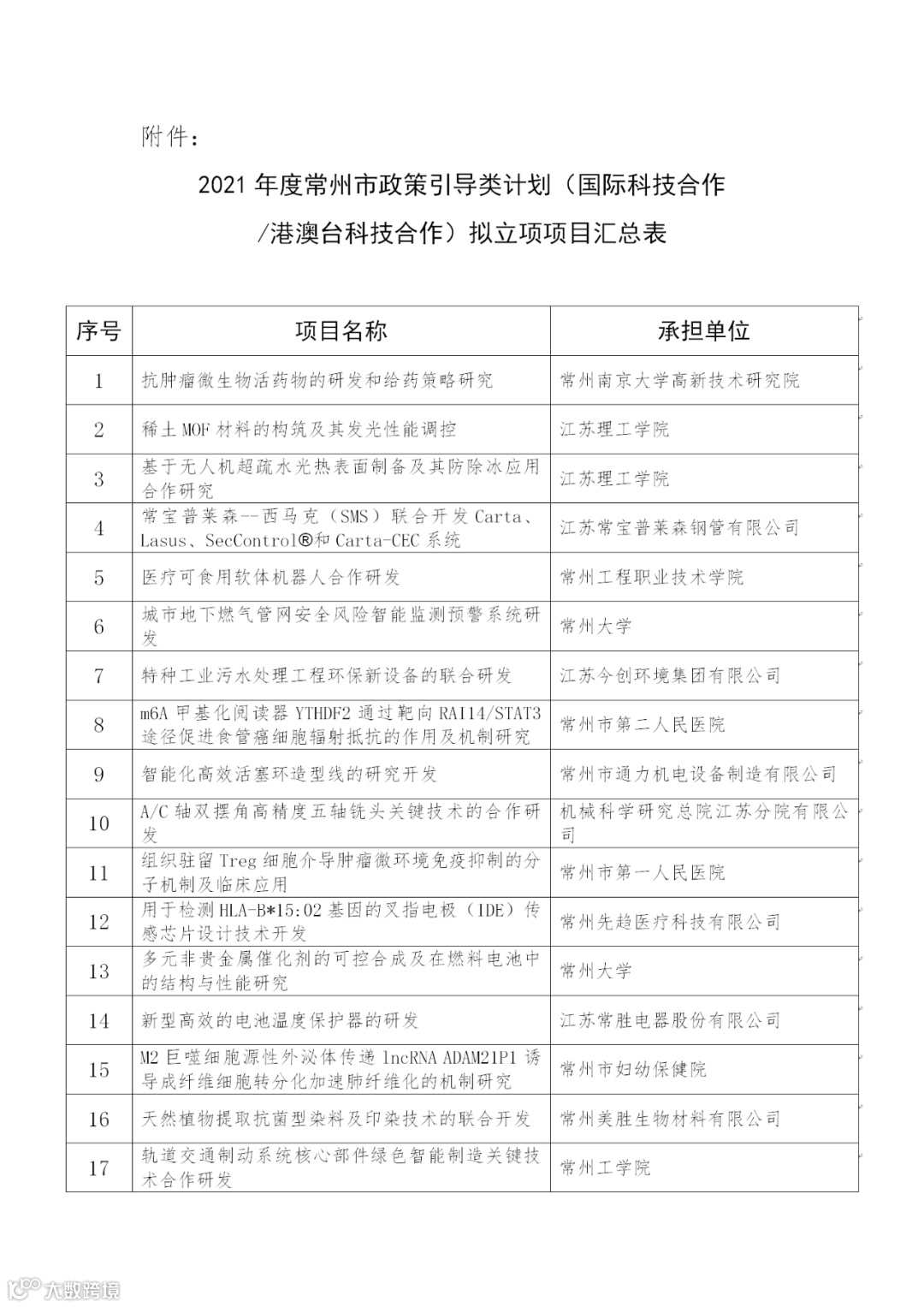 〖公示〗2021年度常州市政策引导类计划(国际科技合作/港澳台科技合作)拟立项项目公示的通告