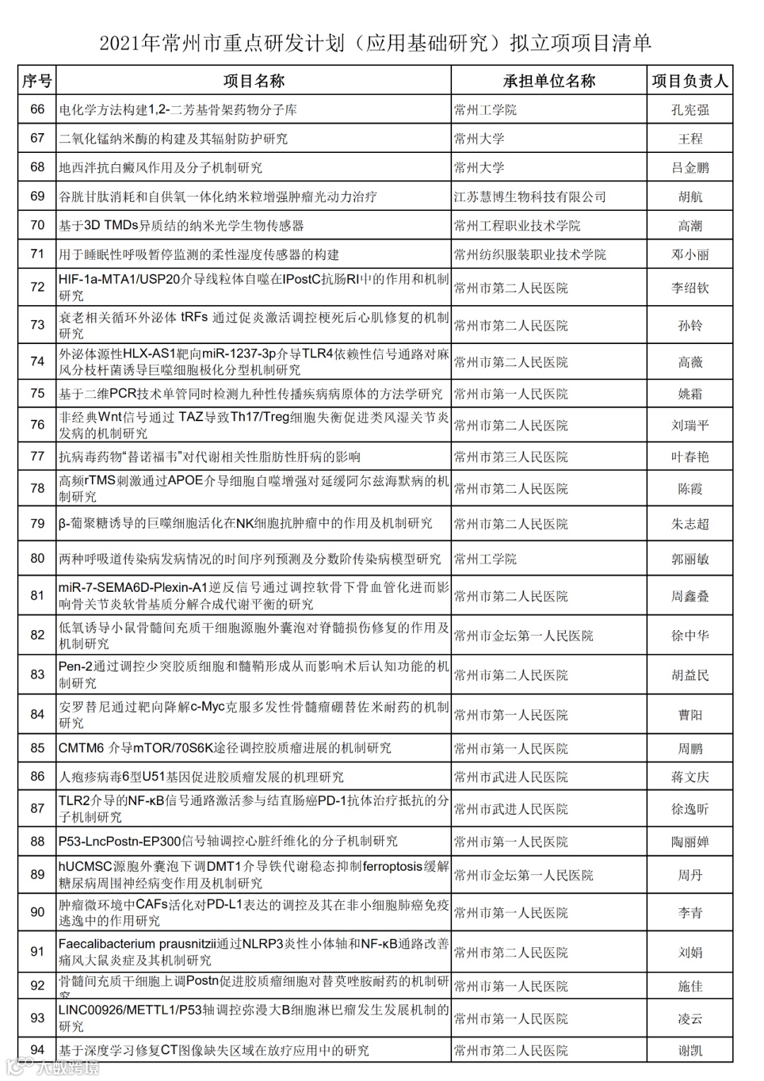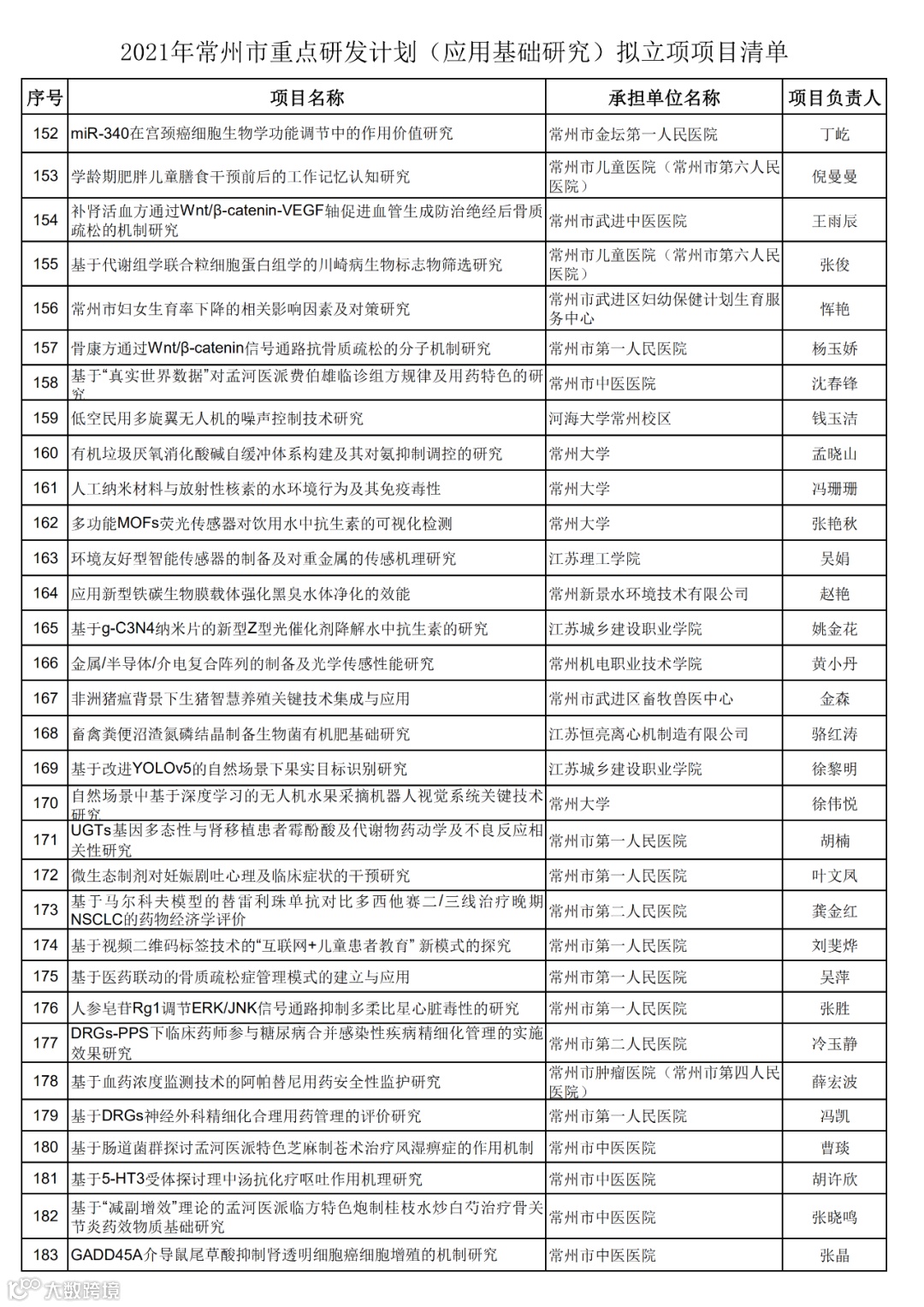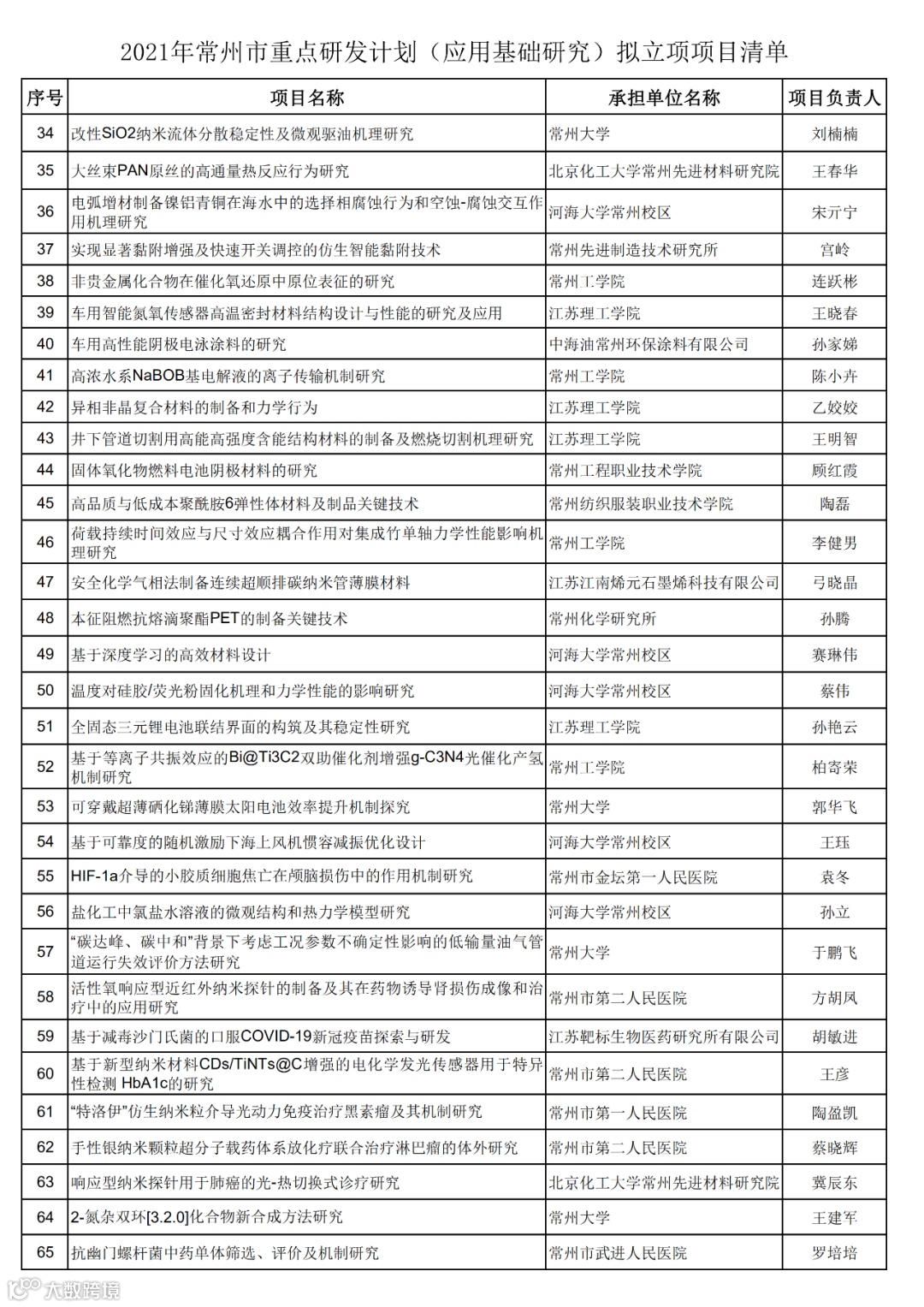 附件1:2021年常州市重点研发计划(应用基础研究)拟立项项目清单