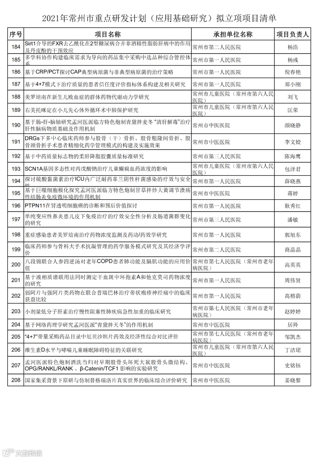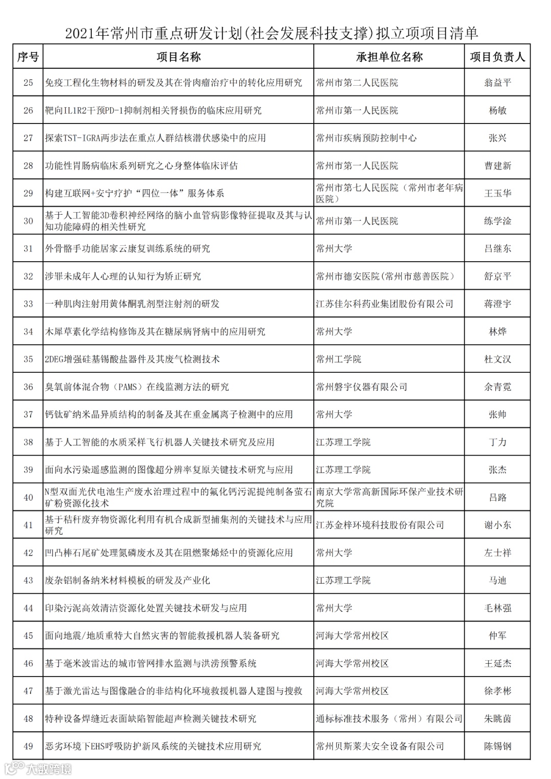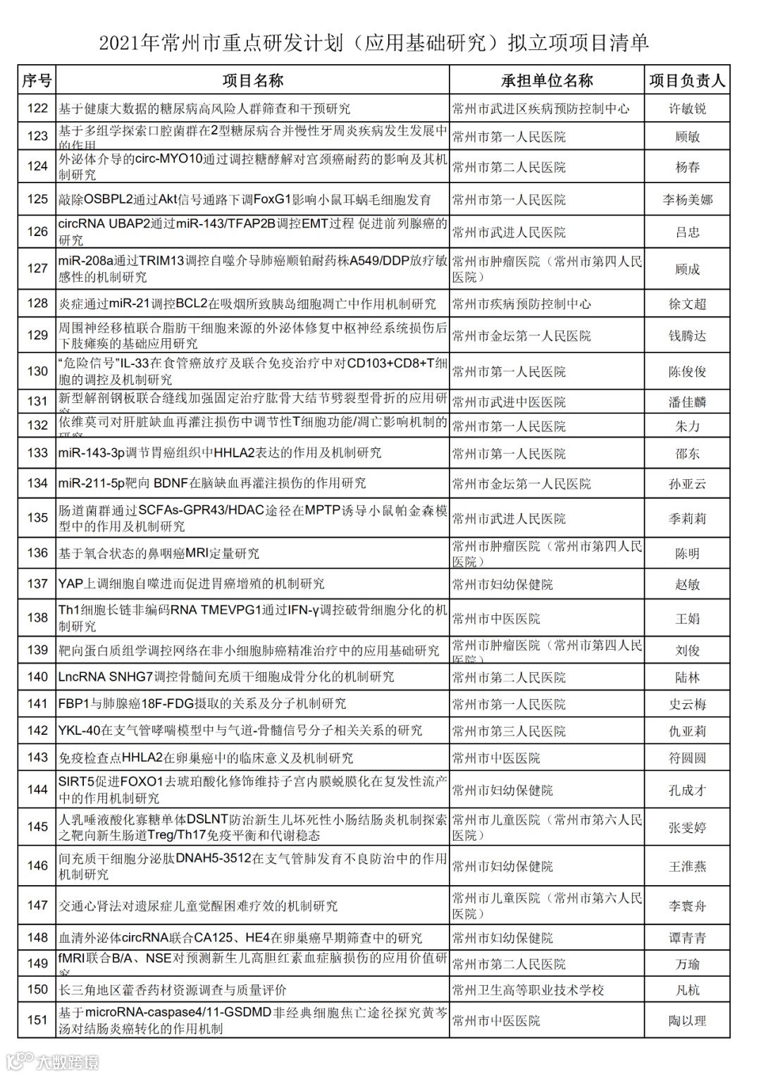 附件1:2021年常州市重点研发计划(应用基础研究)拟立项项目清单
