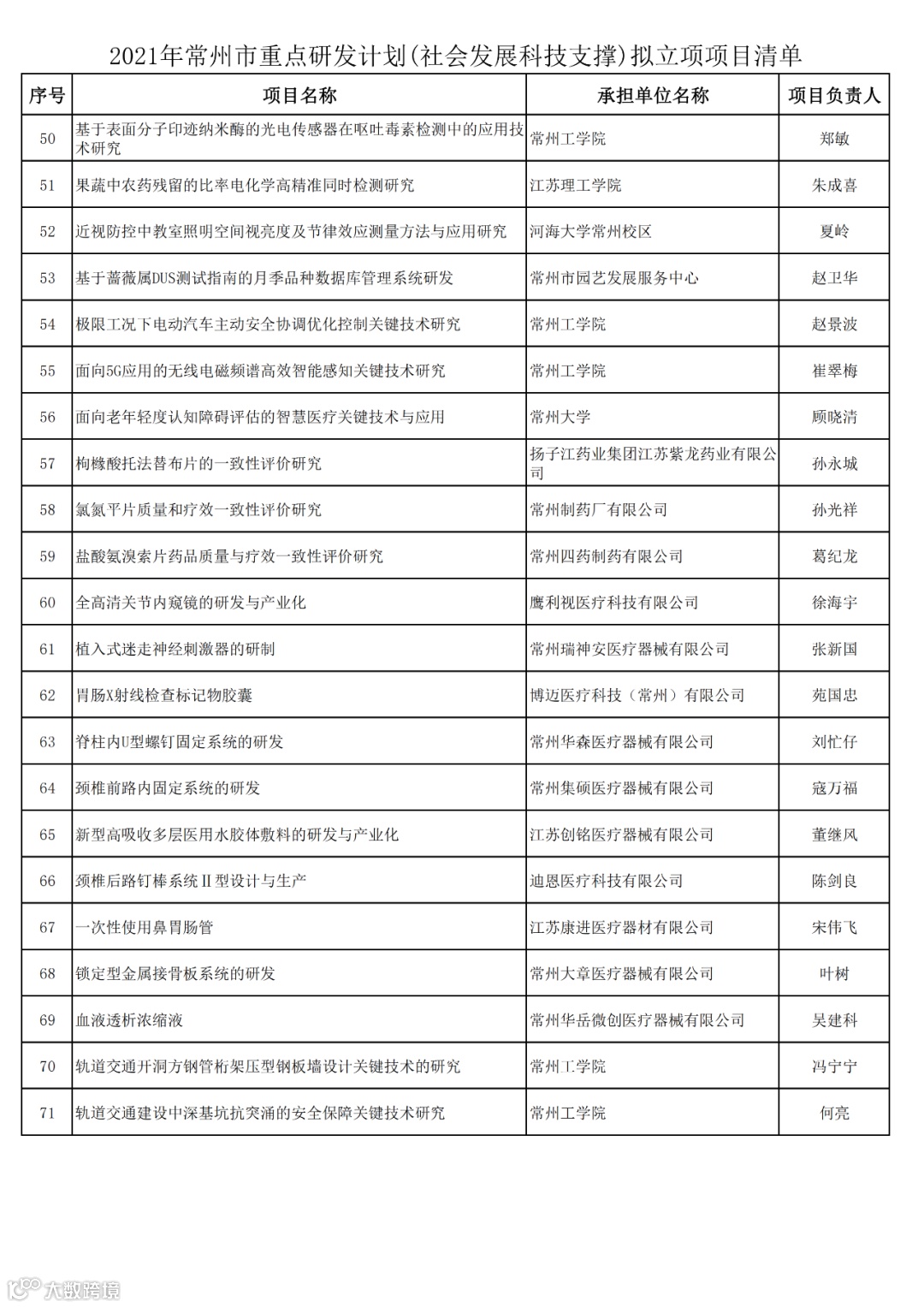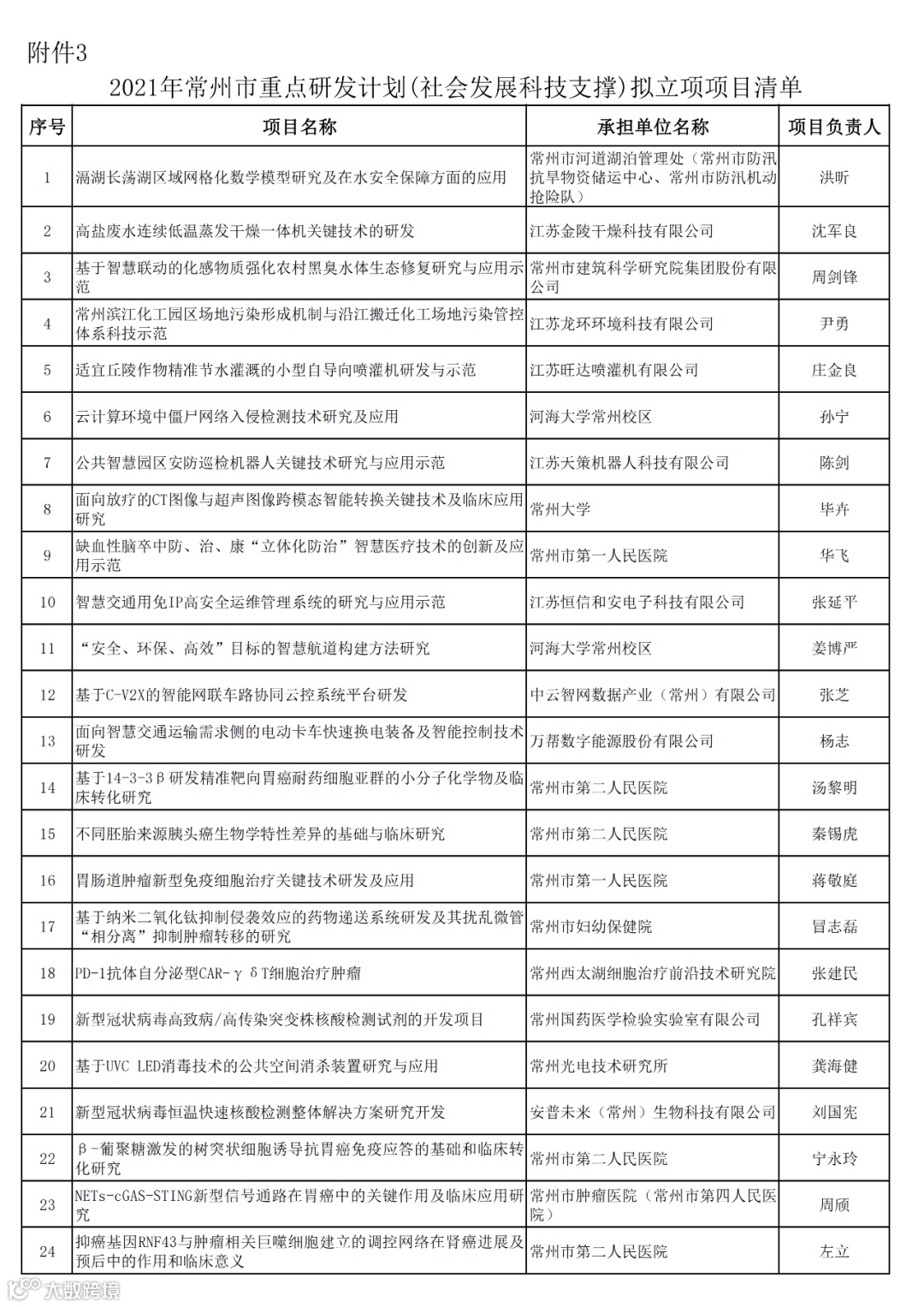 附件3:2021年常州市重点研发计划(社会发展科技支撑)拟立项项目清单