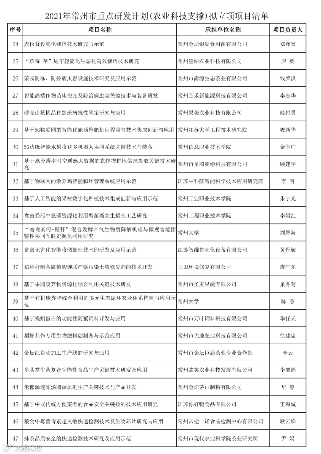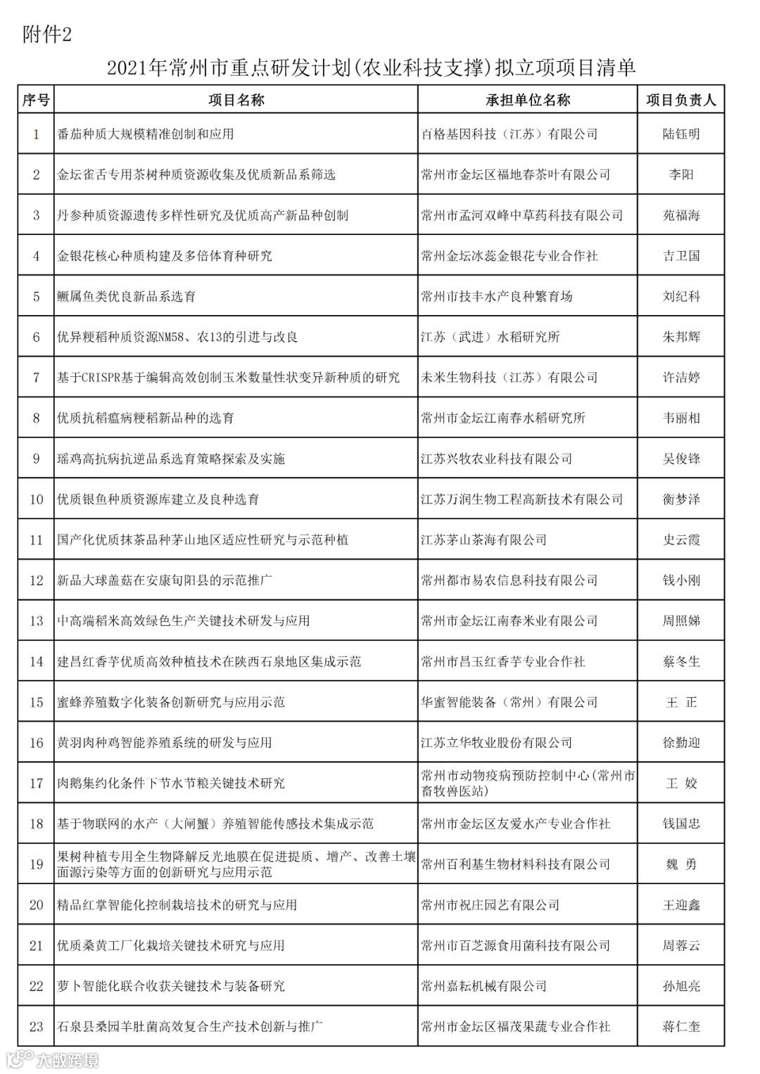 附件2:2021年常州市重点研发计划(农业科技支撑)拟立项项目清单