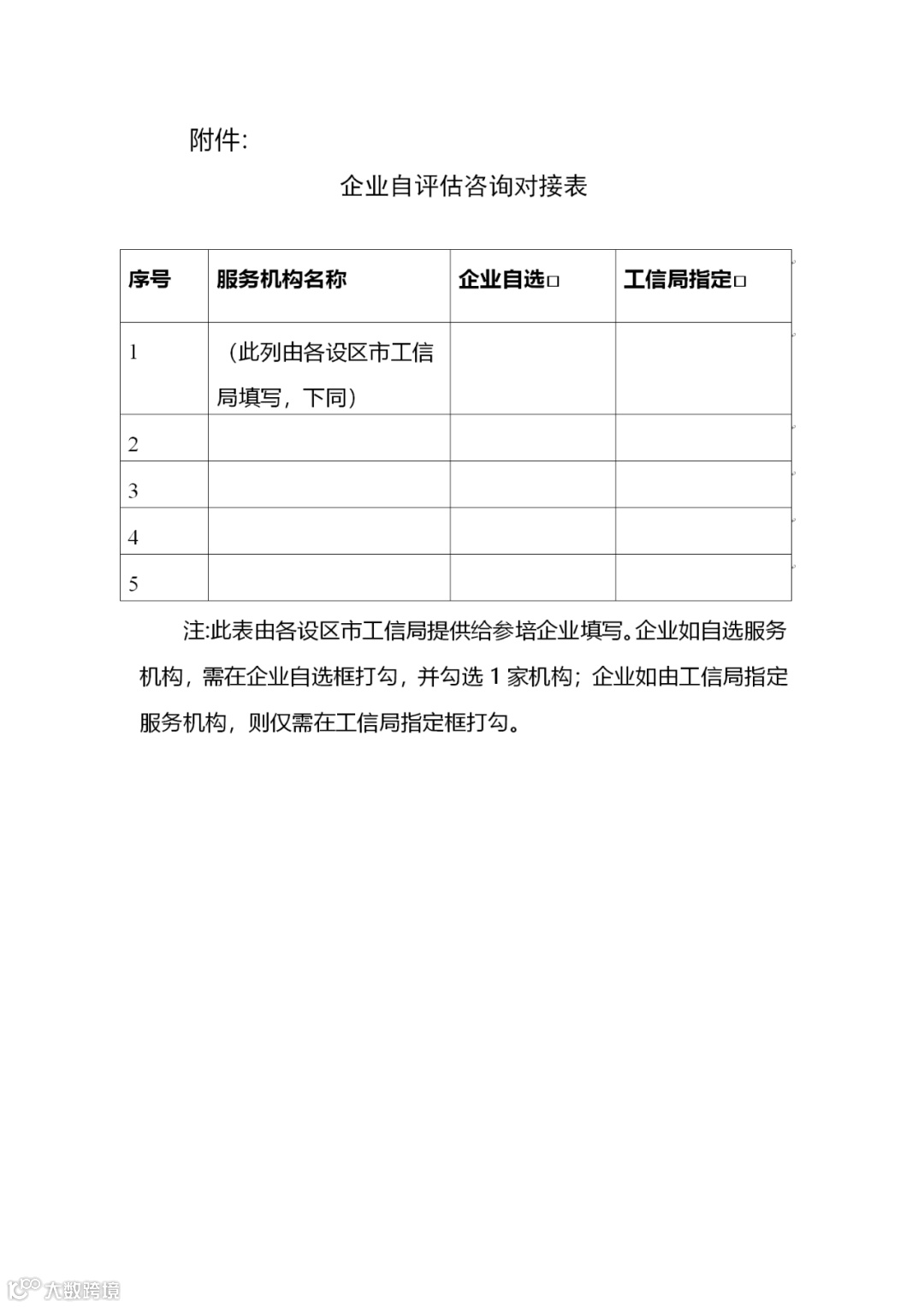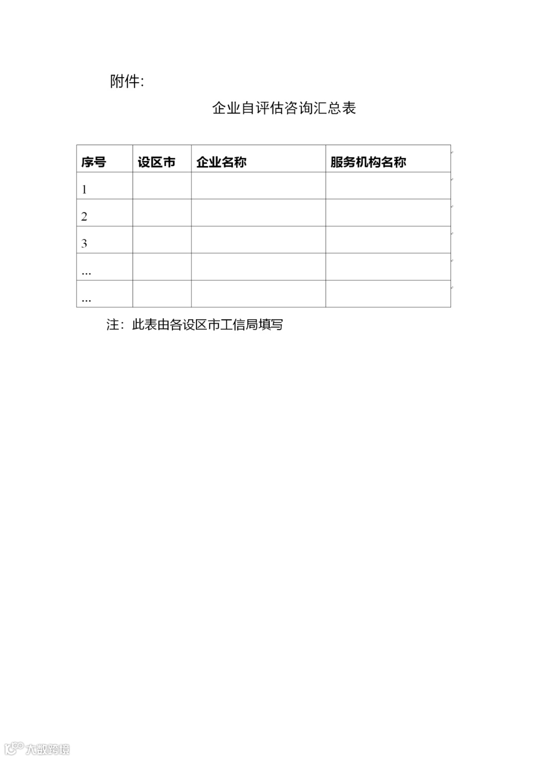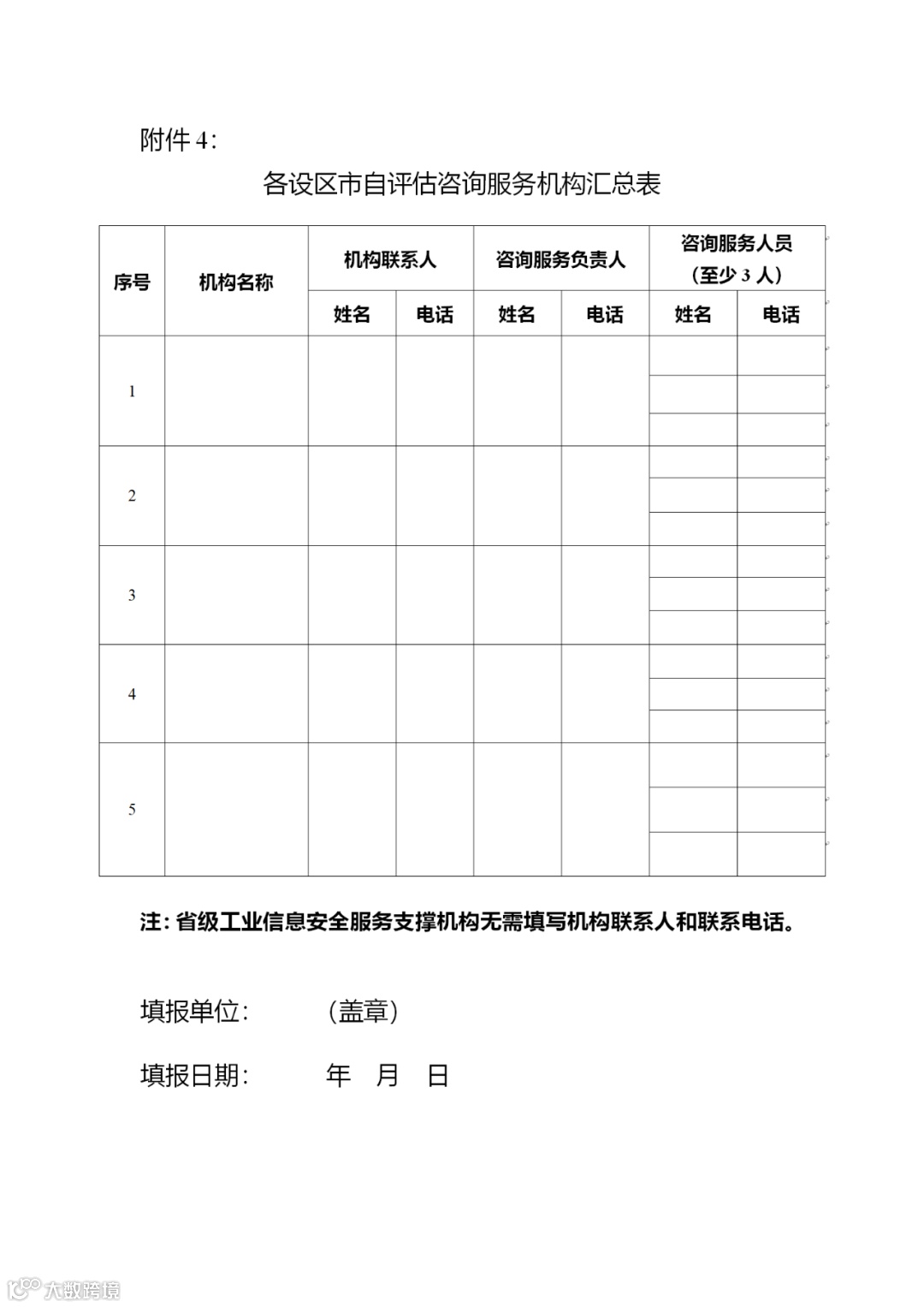 6、请各设区市工信局根据自评估咨询服务机构管理工作要求,于2021年9月10日前填写《各设区市自评估咨询服务机构汇总表》(详见附件4),并将汇总表盖章扫描件和word电子档报送至省工信厅。