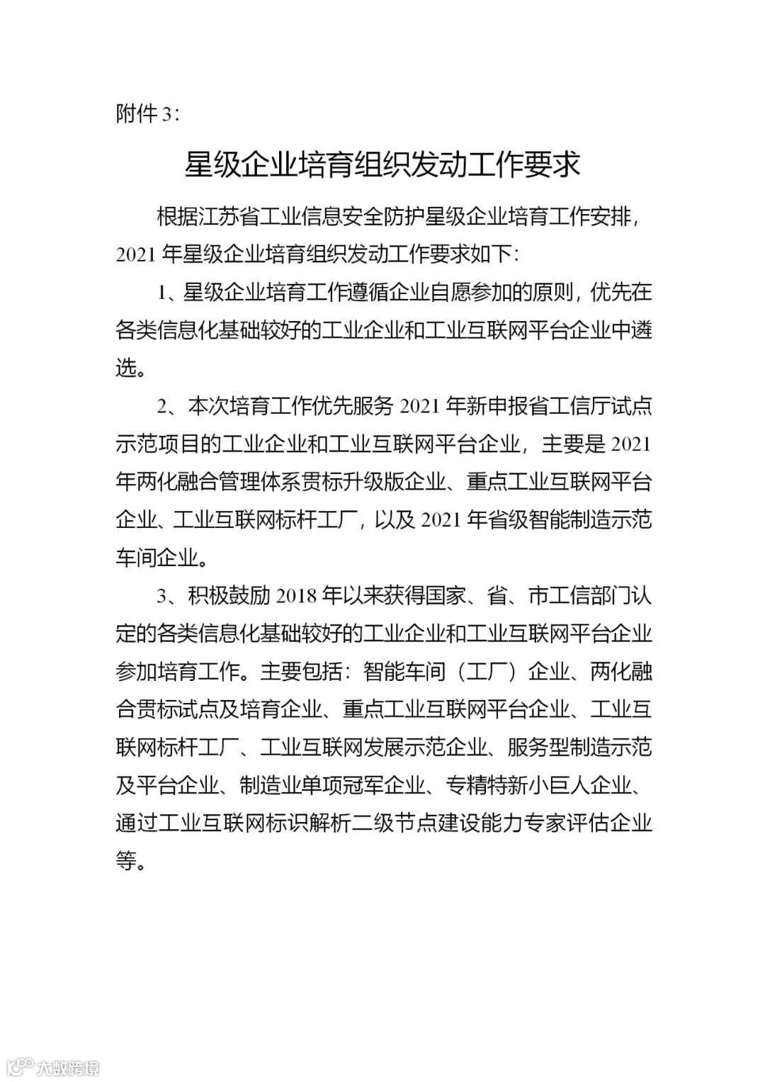 为进一步提升我省工业企业、工业互联网平台企业的信息安全防护能力和水平,根据《关于加强工业互联网安全工作的实施意见》、《2021年工业信息安全工作要点》等文件要求,省工信厅定于2021年8月至11月开展工业信息安全防护星级企业培育工作,现将有关要求通知如下: