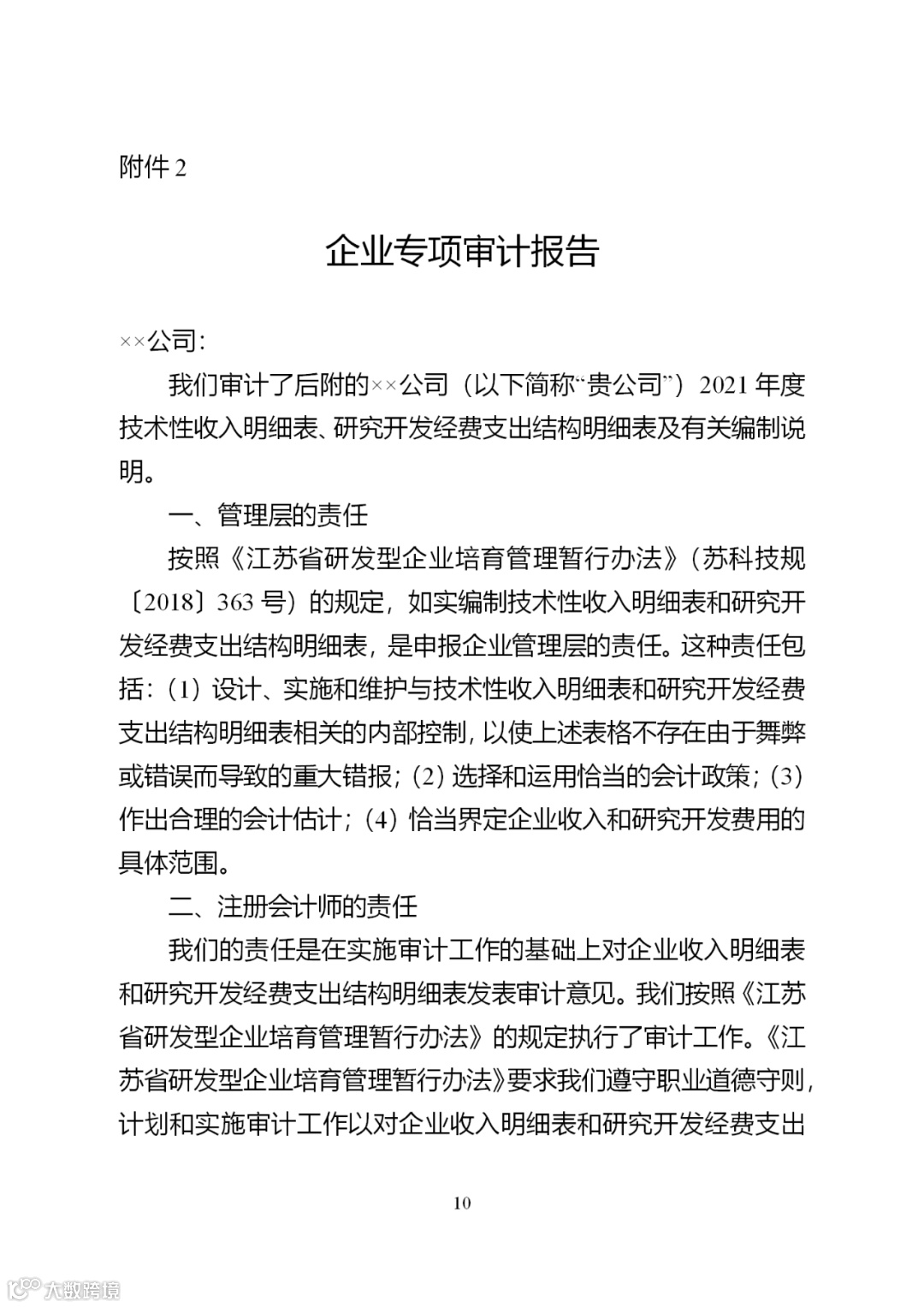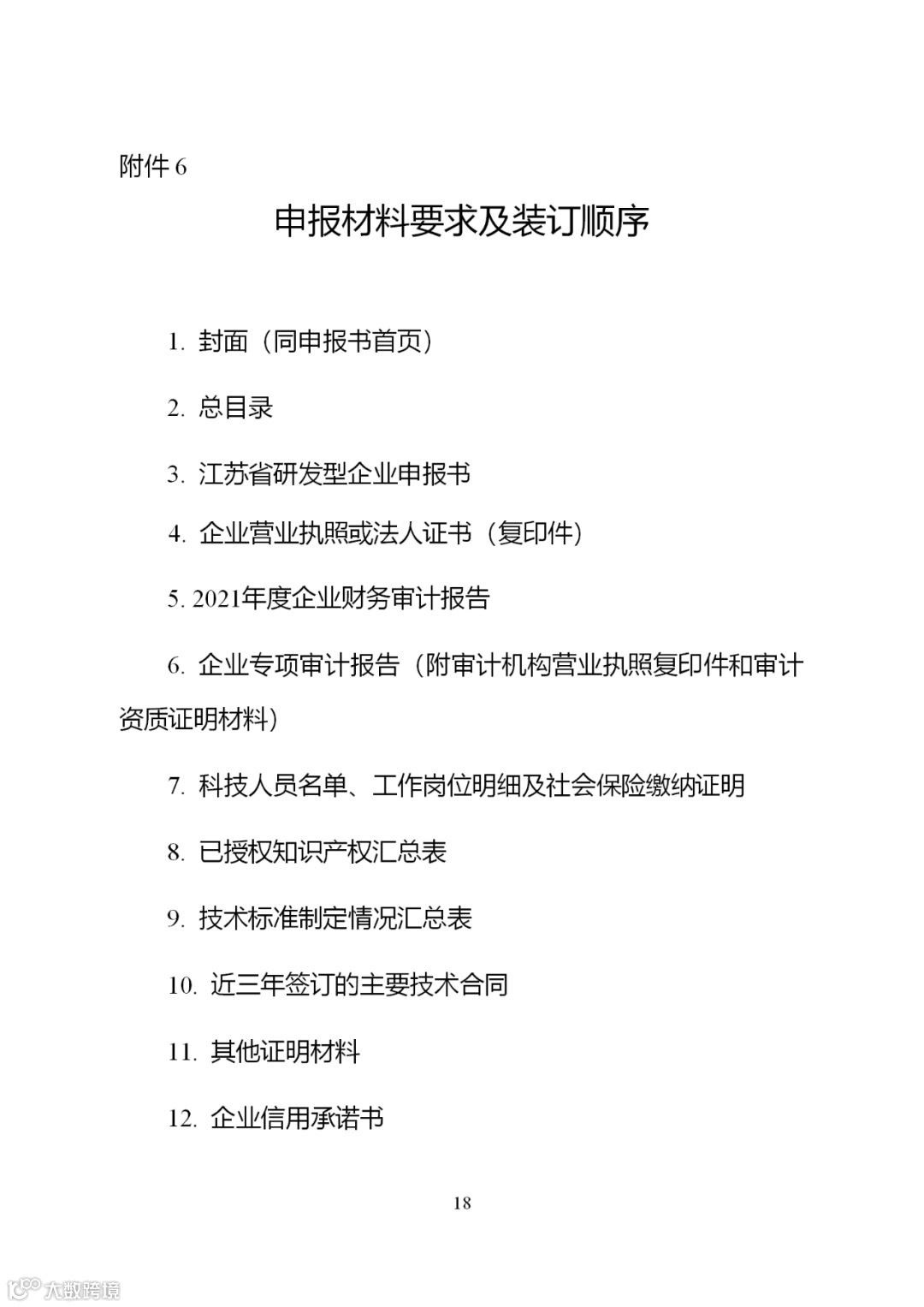 1.申报单位须填写《江苏省研发型企业申报书》(附件1),同时提交《企业专项审计报告》(附件2,由具有资质的省重点科技计划项目经费审计中介机构出具,并提供机构营业执照复印件和审计资质证明材料)、《已授权知识产权汇总表》(附件3)、《技术标准制定情况汇总表》(附件4)和《企业信用承诺书》(附件5)。申报材料由地方科技主管部门逐级推荐,相关佐证材料须与申报书所填内容对应,按装订顺序逐页编制总目录、分类目录和页码,统一用A4纸正反打印,按序简装成册(详见附件6)。