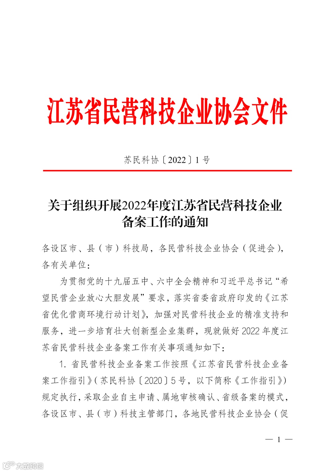 1. 《关于组织开展2022年度江苏省民营科技企业备案工作的通知》(苏民科协〔2022〕1号)