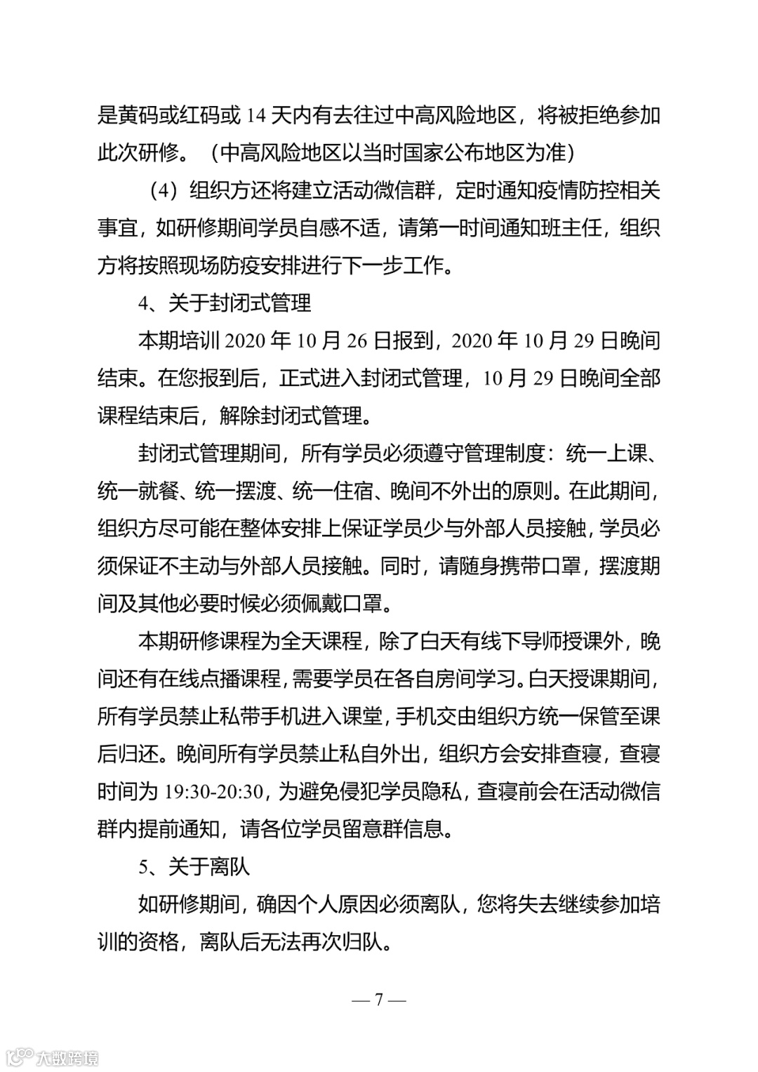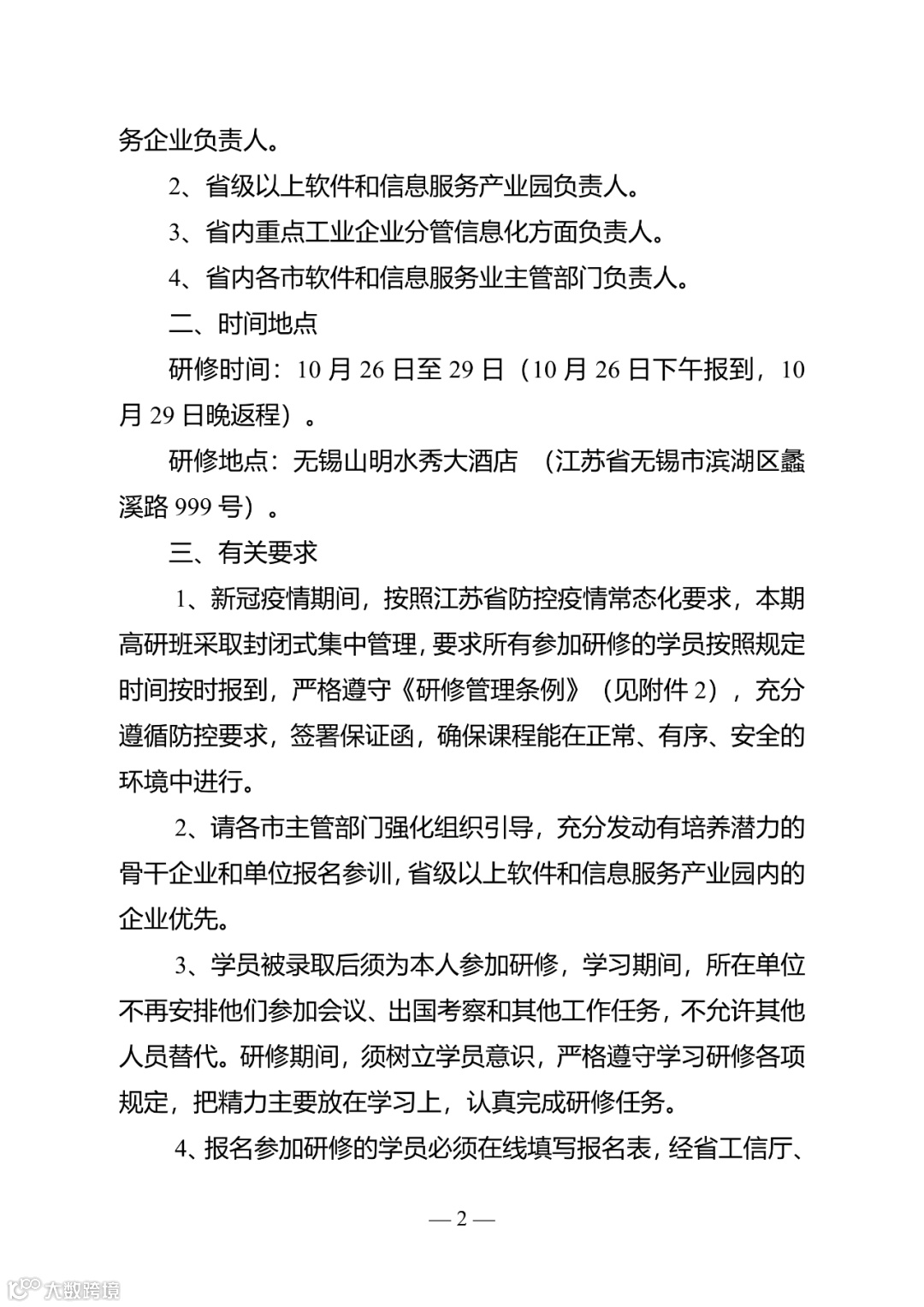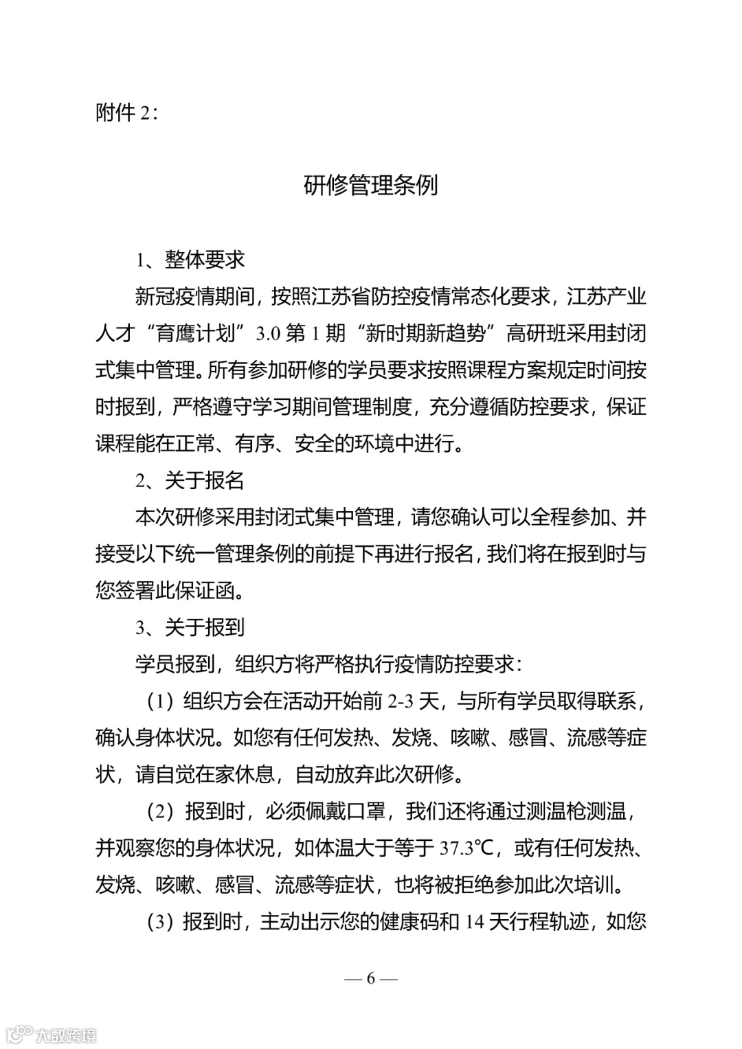 1、新冠疫情期间,按照江苏省防控疫情常态化要求,本期高研班采取封闭式集中管理,要求所有参加研修的学员按照规定时间按时报到,严格遵守《研修管理条例》(见附件2),充分遵循防控要求,签署保证函,确保课程能在正常、有序、安全的环境中进行。