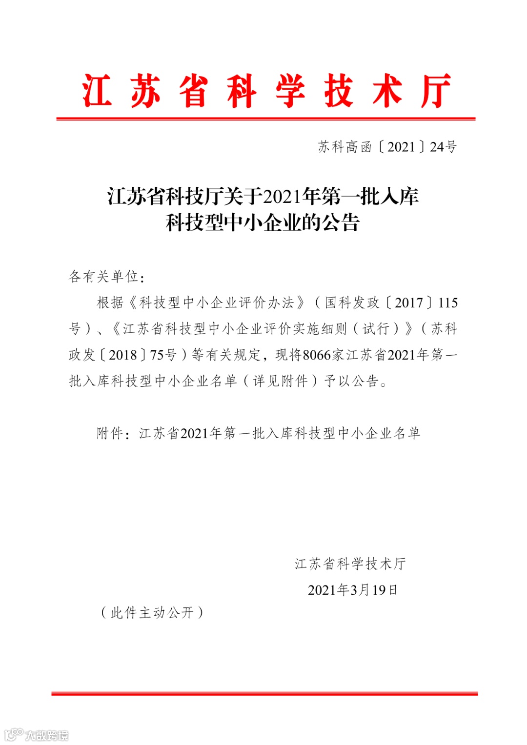 转!江苏省科技厅关于2021年第一批入库科技型中小企业的公告
