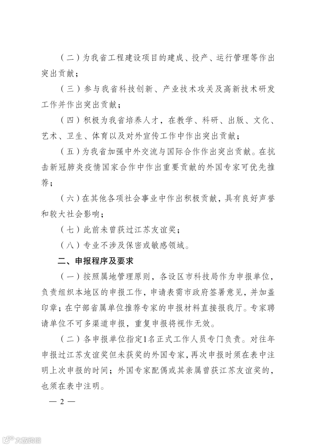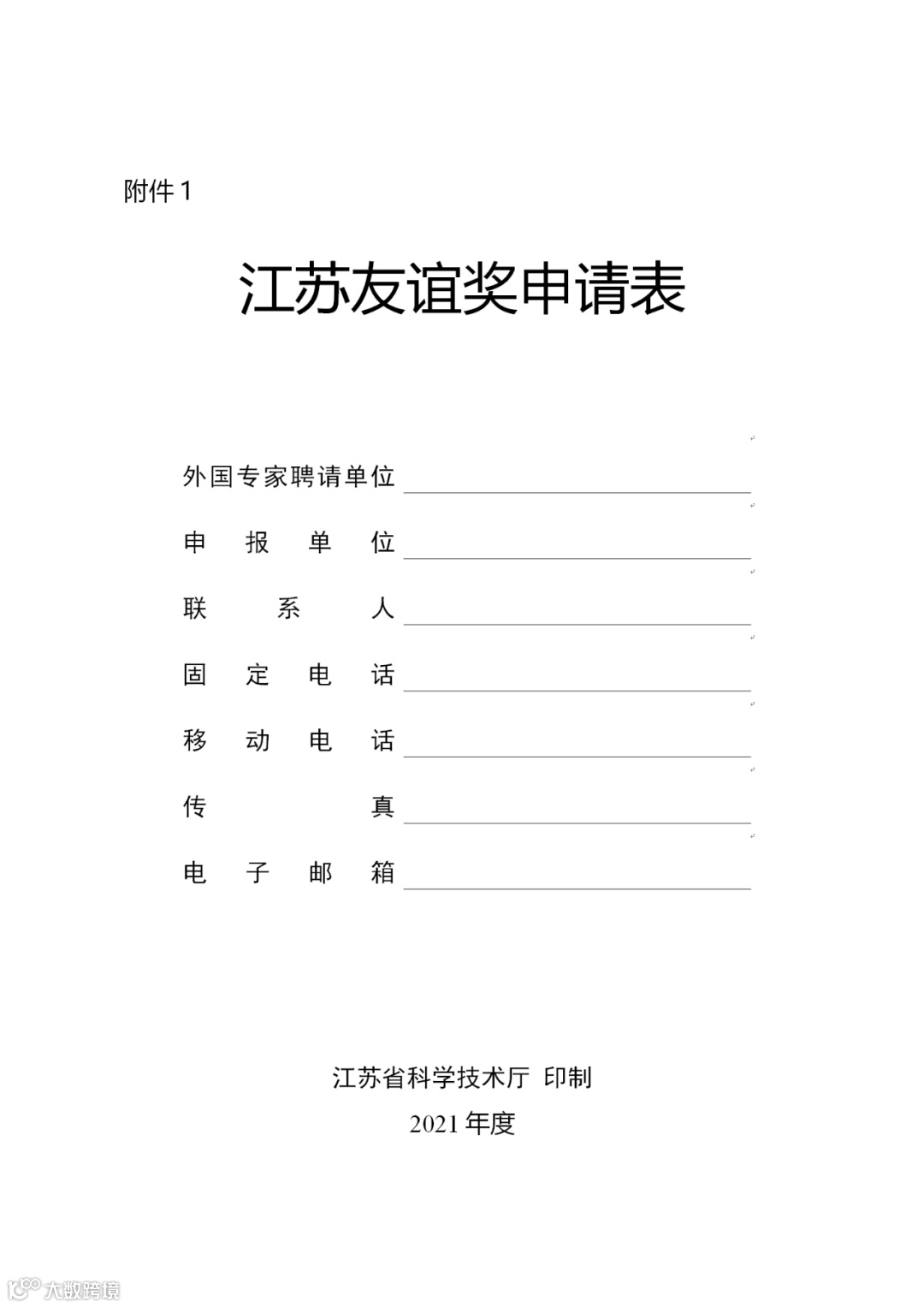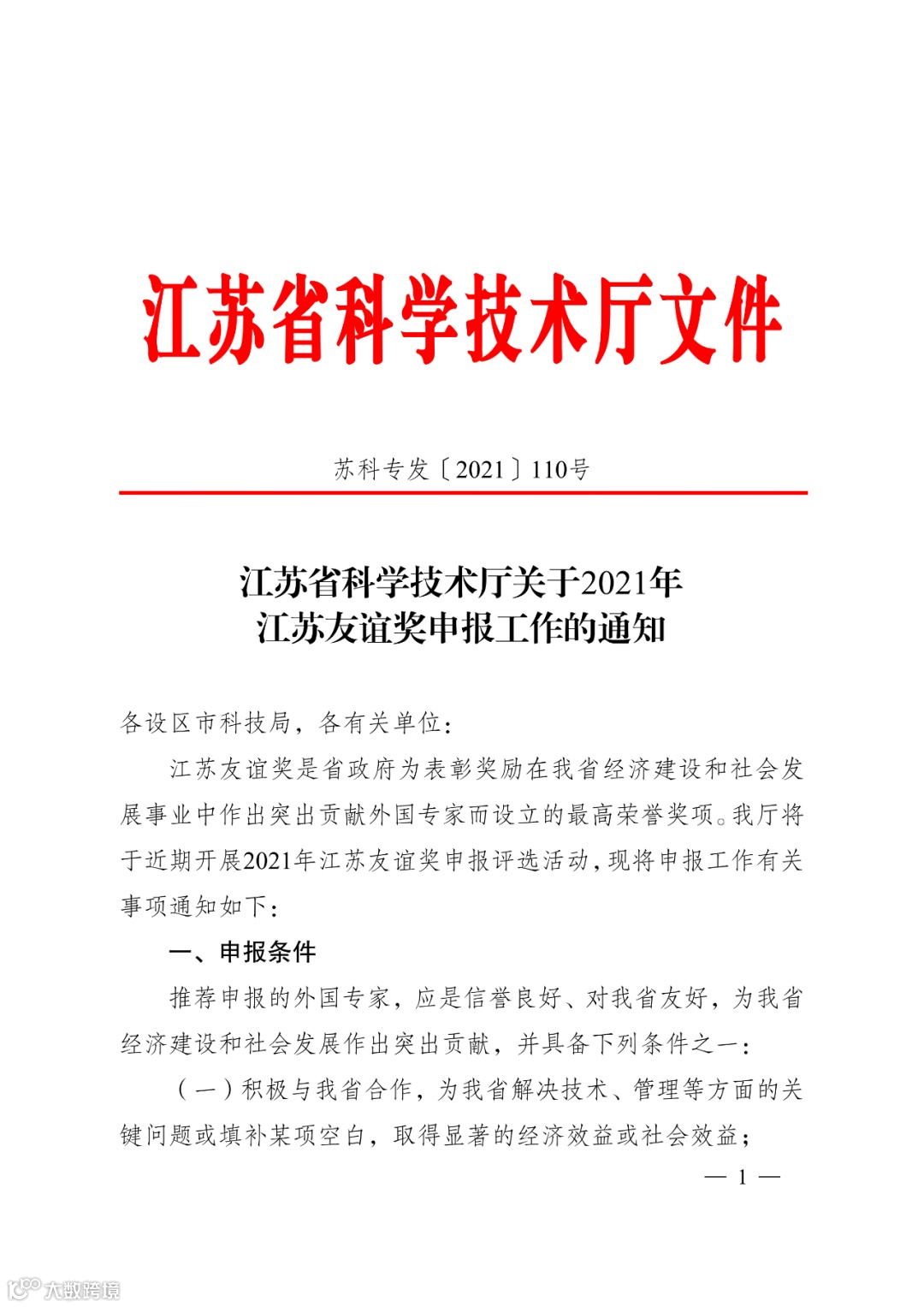 转!江苏省科学技术厅关于2021年江苏友谊奖申报工作的通知