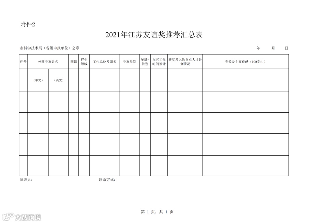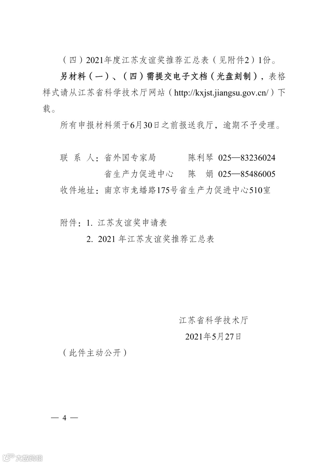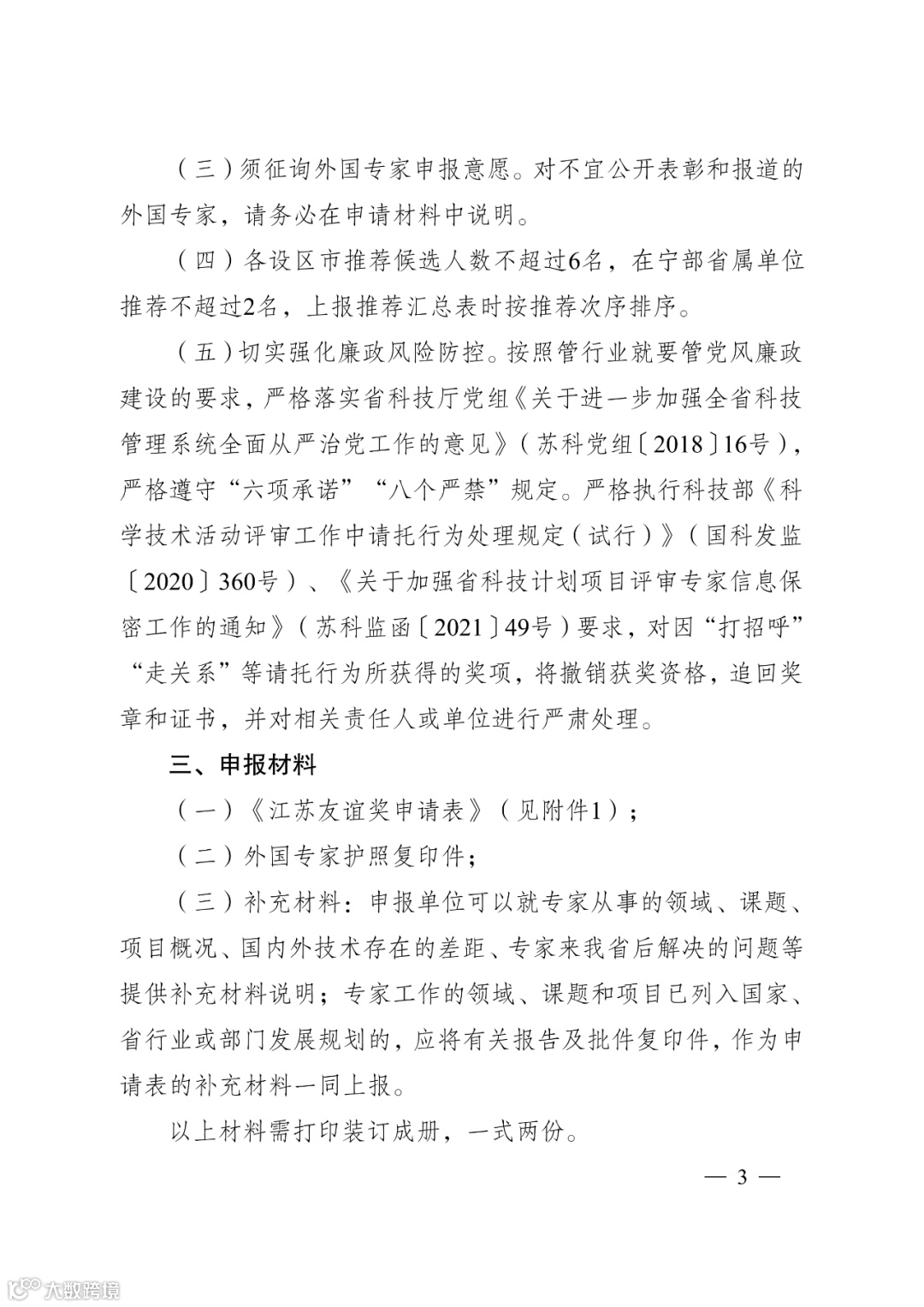 转!江苏省科学技术厅关于2021年江苏友谊奖申报工作的通知