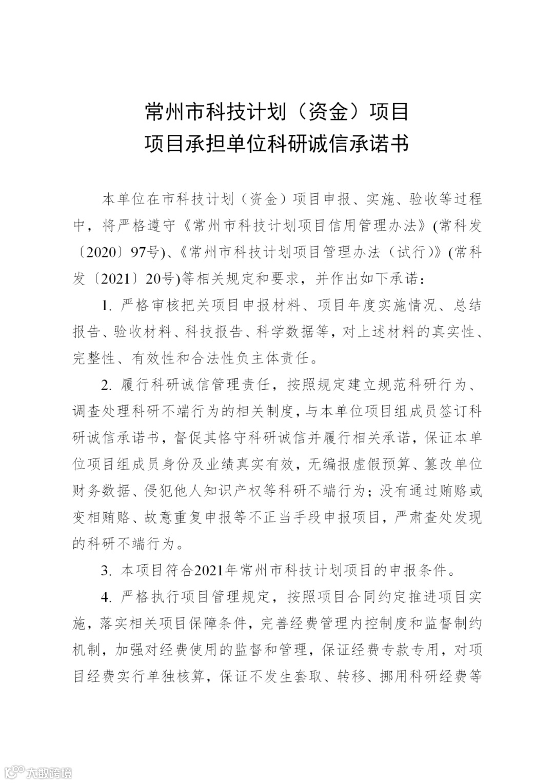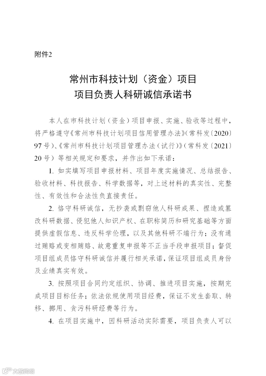 3.每个项目应提供一份市级财政专项资金申请使用科研诚信承诺书(项目承担单位科研诚信承诺书、项目负责人科研诚信承诺书,固定格式请在市科技服务平台附件中下载)。签字盖章后扫描并上传至系统,承诺书原件不要和书面材料装订在一起,由主管部门汇总后统一提交至常州市科技资源统筹服务中心科技项目服务科(常州市广化街1号金谷大厦9楼910室);