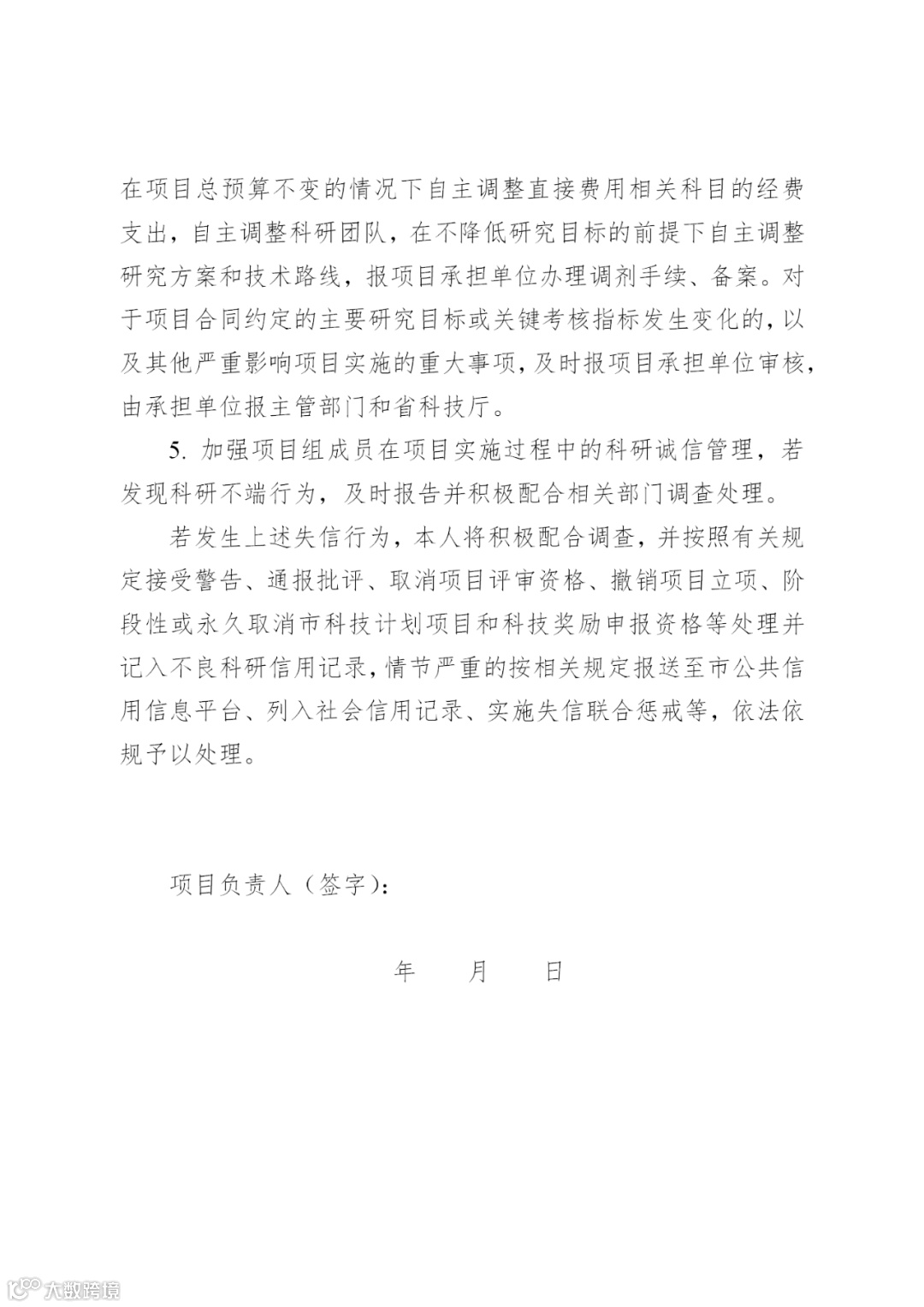 2.全面实施科研诚信承诺制。项目负责人和承担单位必须在项目申报时签署科研诚信承诺书,进一步明确各自承诺事项和违背相关承诺的责任。有不良信用记录的单位和个人,不得申报本年度计划项目。