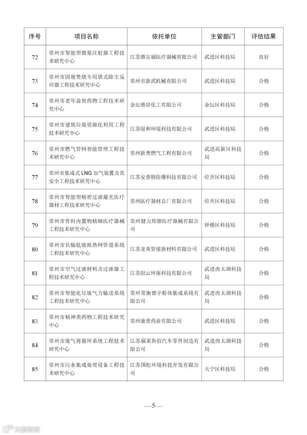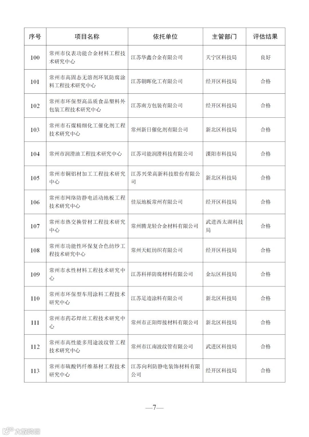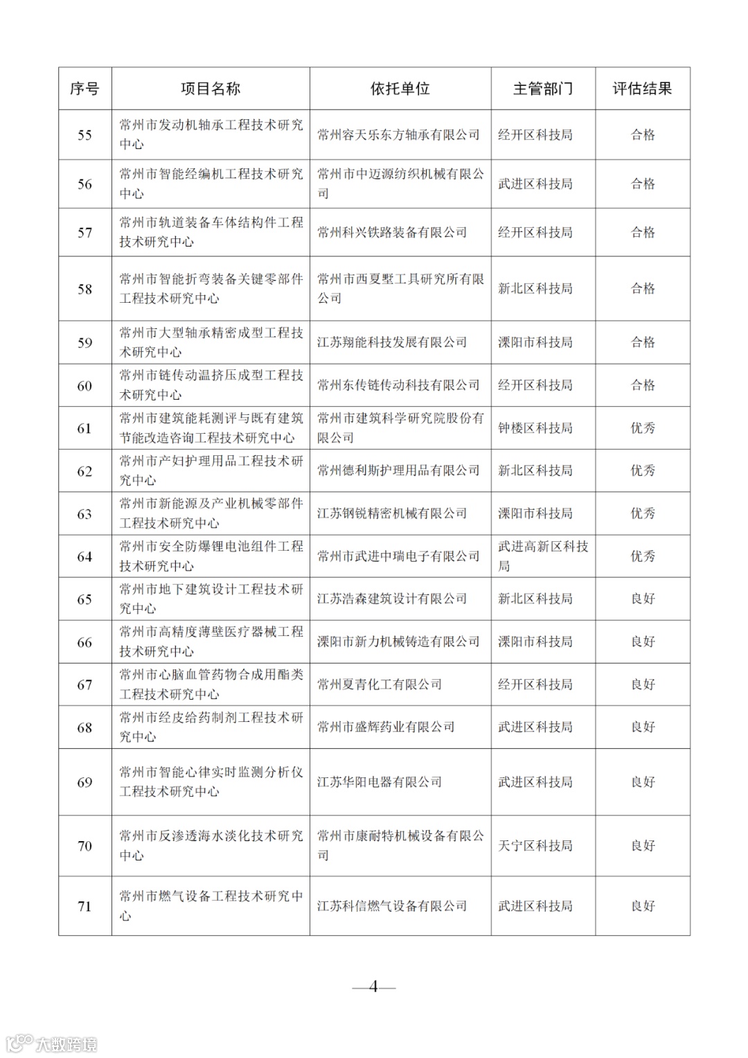 根据《关于组织申报2020年常州市科技基础设施建设计划项目的通知》(常科发〔2020〕60号)、《关于开展2020年常州市工程技术研究中心绩效评估工作的通知》(常科发〔2020〕106号)等文件的要求,我局组织对2008年、2011年、2014年、2017年四个年度已通过验收的共119家市级工程技术研究中心开展了绩效评估工作。经评估申报、形式审查、专家评审、局长办公会审定等程序,结果如下:22家单位评估优秀,12家单位评估良好,14家单位评估合格,29家单位未参加绩效评估,予以摘牌(具体名单见附件)。现将绩效评估结果进行公示,公示期为2020年8月25日—8月31日17:00时。