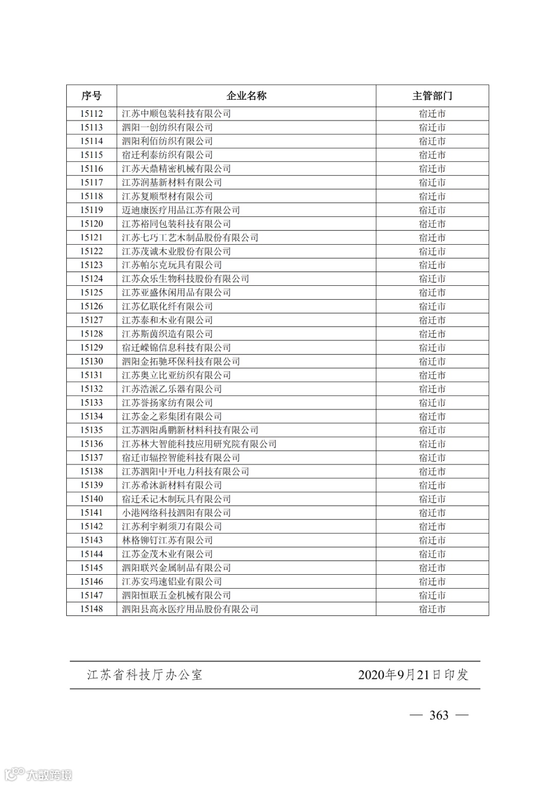 各设区市科技局、财政局:为贯彻落实省政府印发的《江苏省推进高新技术企业高质量发展的若干政策》,深入实施高新技术企业培育“小升高”行动计划,进一步加强高新技术企业培育,根据《江苏省科学技术厅江苏省财政厅关于做好2020年度江苏省高新技术企业培育工作的通知》(苏科高发〔2020〕6号)有关要求,经企业申报、专家评审、网上公示、地方审查推荐等程序,现确定15148家企业作为省高新技术企业培育库2020年度入库企业(名单见附件)。希望各地科技部门会同财政部门进一步加强对入库企业的苏科高发〔2020〕241号指导和支持,加大培育资金投入力度,健全高新技术企业培育体系。入库企业要进一步加强新产品、新技术、新工艺、新业态创新,加快成长为高新技术企业,为壮大我省高新技术企业群体提 供支撑。
