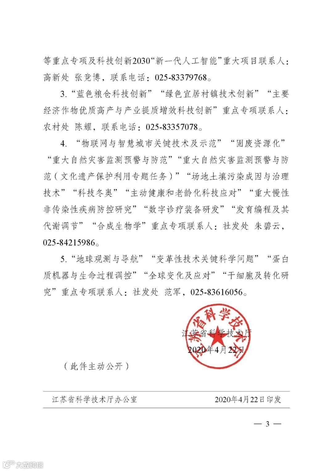 3.“蓝色粮仓科技创新”“绿色宜居村镇技术创新”“主要经济作物优质高产与产业提质增效科技创新”重点专项联系人:农村处 陈耀,联系电话:025-83357078。