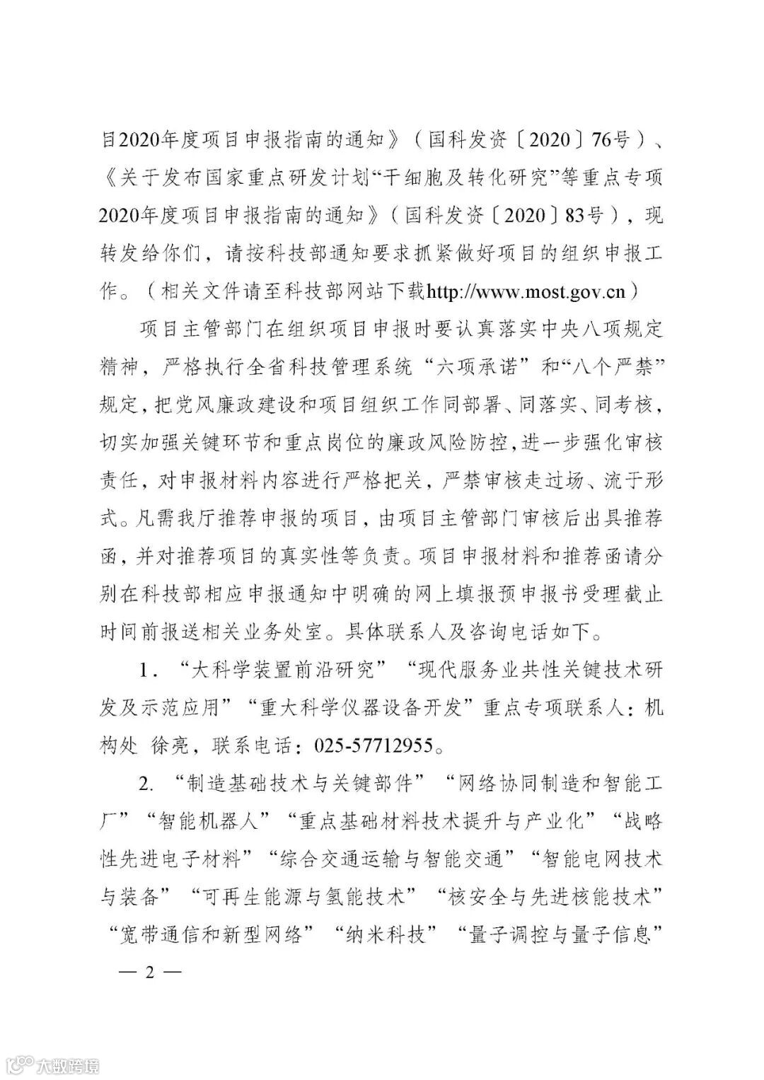 5.“地球观测与导航”“变革性技术关键科学问题”“蛋白质机器与生命过程调控”“全球变化及应对”“干细胞及转化研究”重点专项联系人:社发处 范军,025-83616056。
