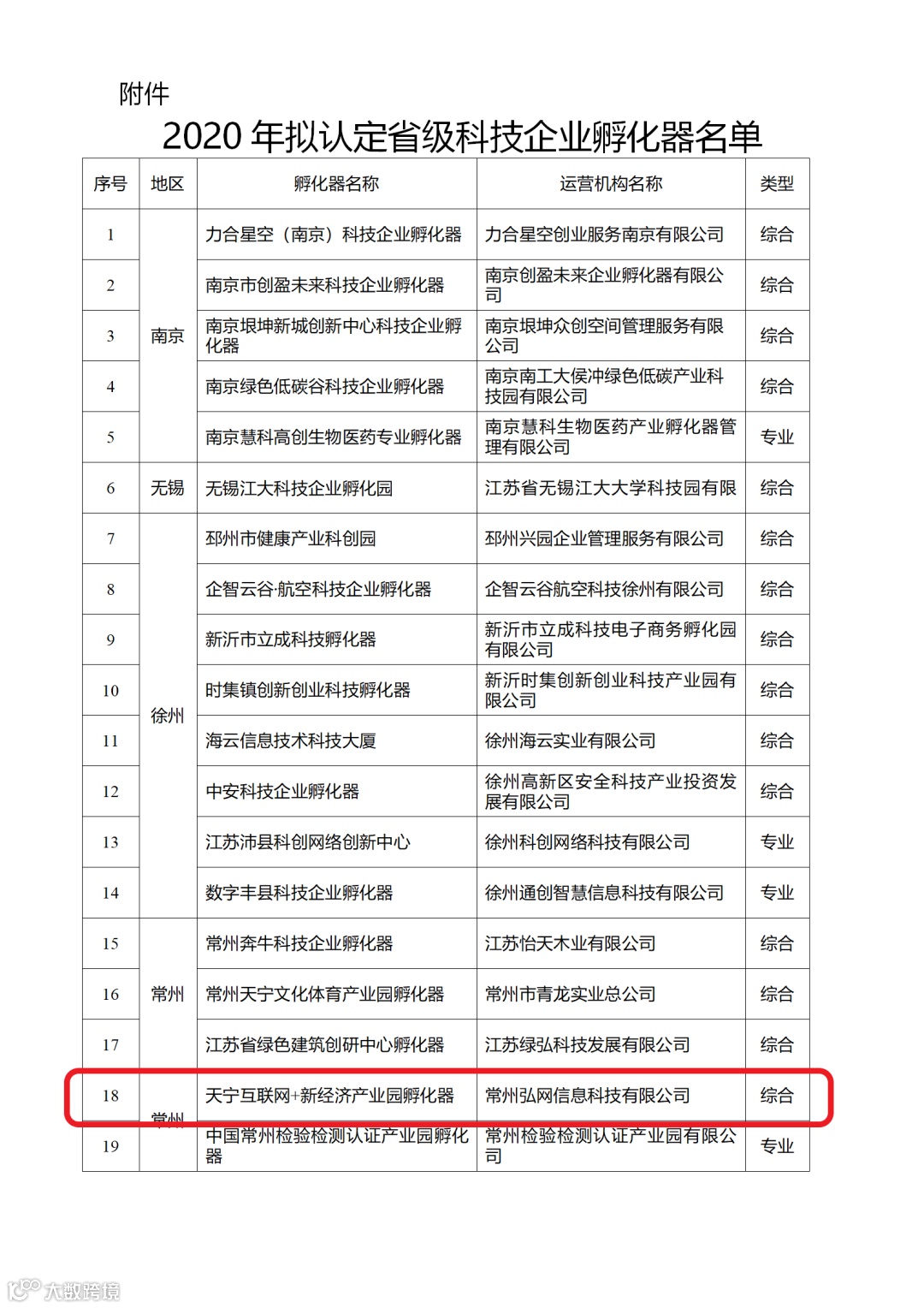 9月8日,江苏省科技厅发布了关于2020年拟认定省级科技企业孵化器名单公示,其中由常州科创辅导的“天宁互联网+新经济产业园”项目就在公示名单内,如下图所示: