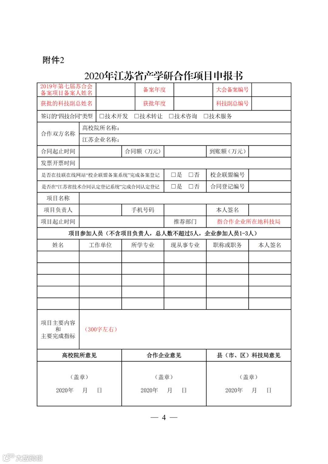 3、申报2020年江苏省产学研合作项目须提交“项目申报书” 原件1份。请各设区市科技局分阶段将本地区“项目申报书”汇总后报送省科技厅区域创新处。咨询电话:025-83363139。
