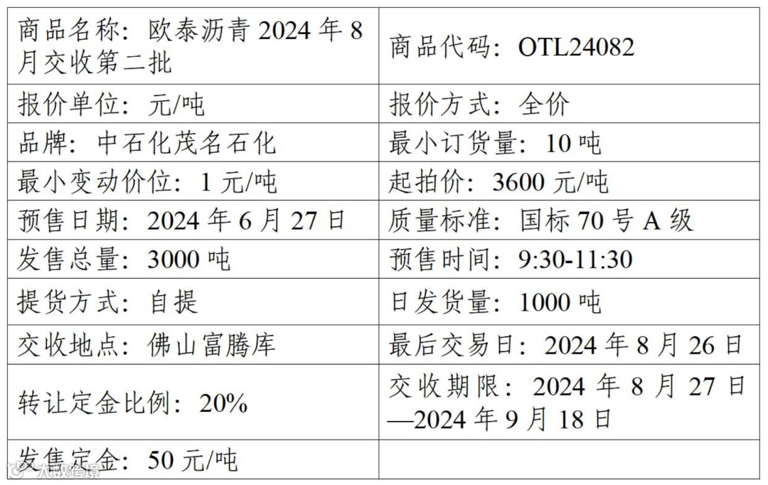 物产中大欧泰有限公司定于2024年6月27日在产能预售系统中发售2024年8月交收第二批沥青产品,具体信息如下: