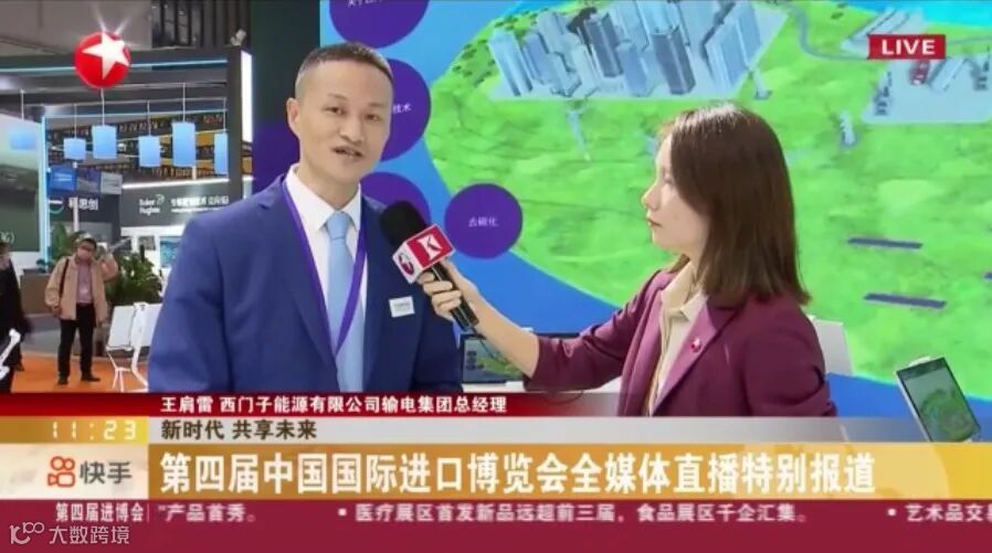 西门子能源有限公司输电集团总经理王肩雷向观众介绍西门子能源在本次进博会全景式呈现整个能源价值链上的低碳技术、产品和解决方案。