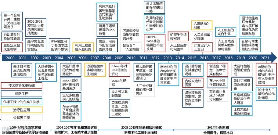 进入21世纪后,合成生物学迎来迅速发展的时代,受到各国政府、学术界、产业界的高度关注。斯坦福教授Eric Kool在2000年对其重新定义为基于系统生物学的遗传工程,发展至今,大致可分为四个阶段:萌芽期、缓慢发展期、快速成长期和创新应用期。
